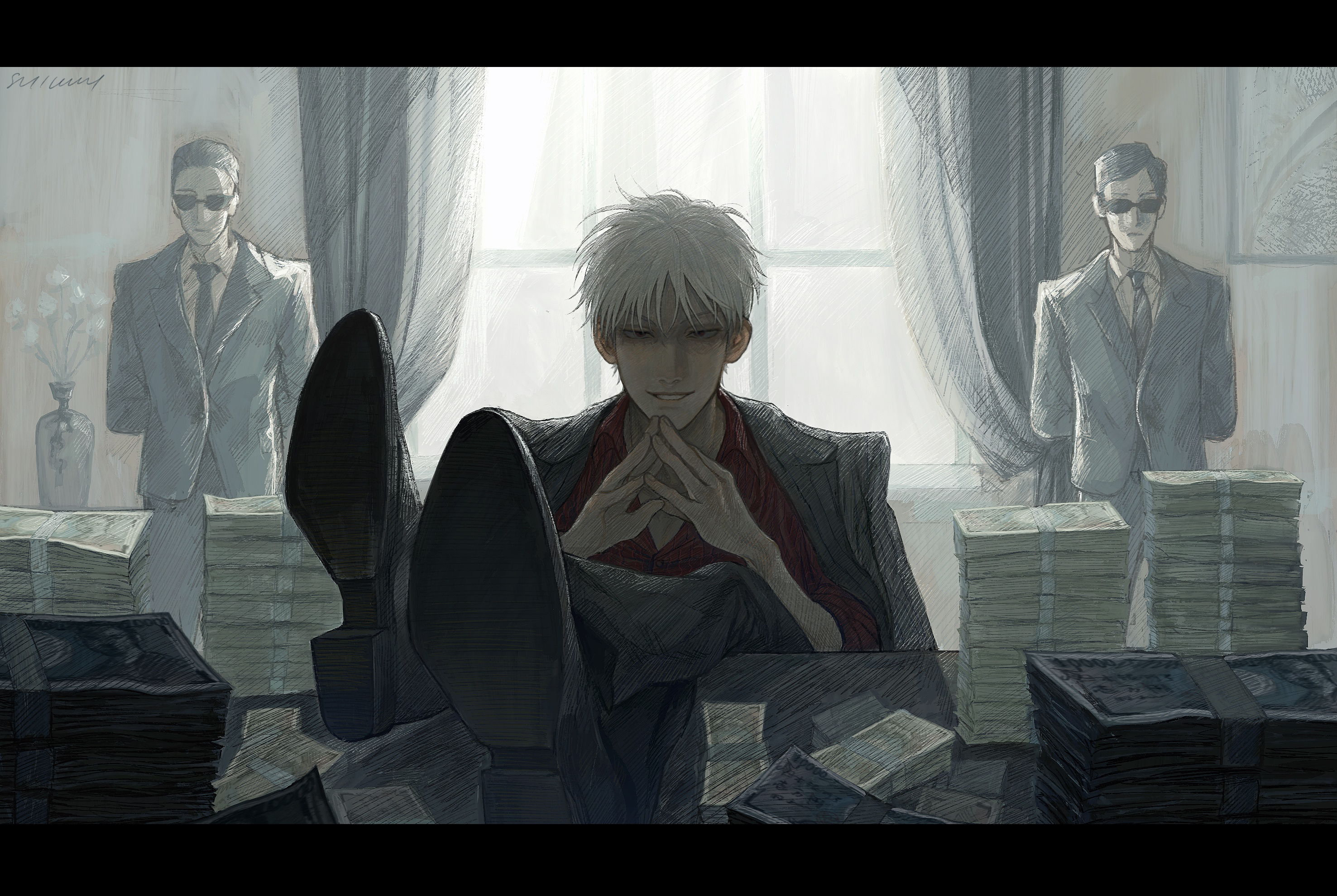 3boys akagi:_yami_ni_oritatta_tensai akagi_shigeru banknote black_footwear black_necktie black_pants blazer closed_mouth collared_shirt commentary_request curtains expressionless feet_on_table flower formal_clothes fukumoto_mahjong full_body grey_jacket grin highres indoors jacket jacket_on_shoulders letterboxed looking_at_viewer male_focus money multiple_boys necktie pants red_eyes red_shirt shiloh_815 shirt shoe_soles shoes short_bangs short_hair sitting smile solo_focus standing steepled_fingers suit sunglasses vase white_flower white_hair window