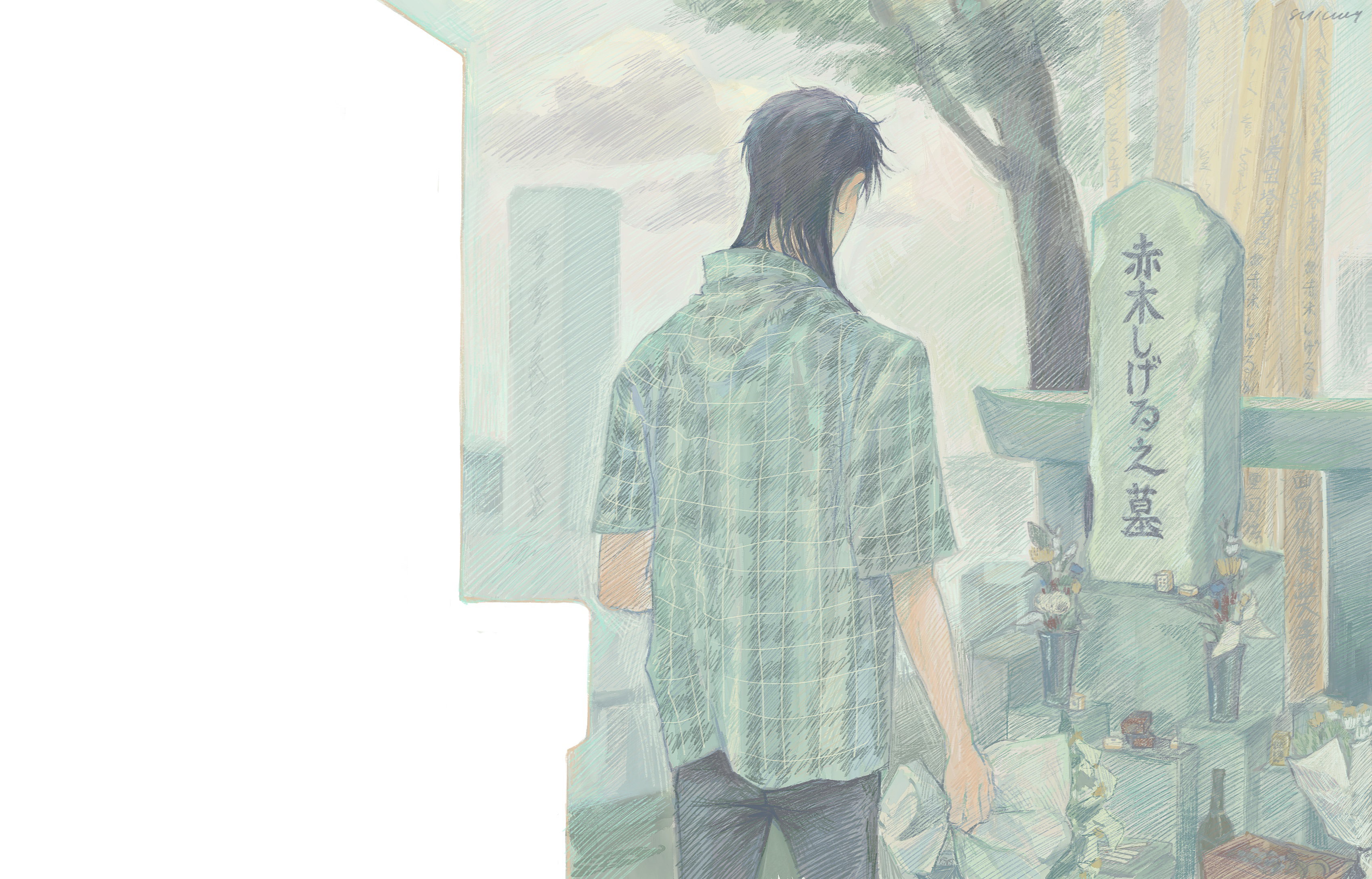 1boy absurdres akagi:_yami_ni_oritatta_tensai black_hair black_pants bouquet cloud commentary_request cowboy_shot flower from_behind fukumoto_mahjong graveyard green_shirt green_sky green_theme highres itou_kaiji tobaku_mokushiroku_kaiji long_hair male_focus outdoors pants plaid_clothes plaid_shirt shiloh_815 shirt short_sleeves sky solo standing tombstone tree white_flower yellow_flower