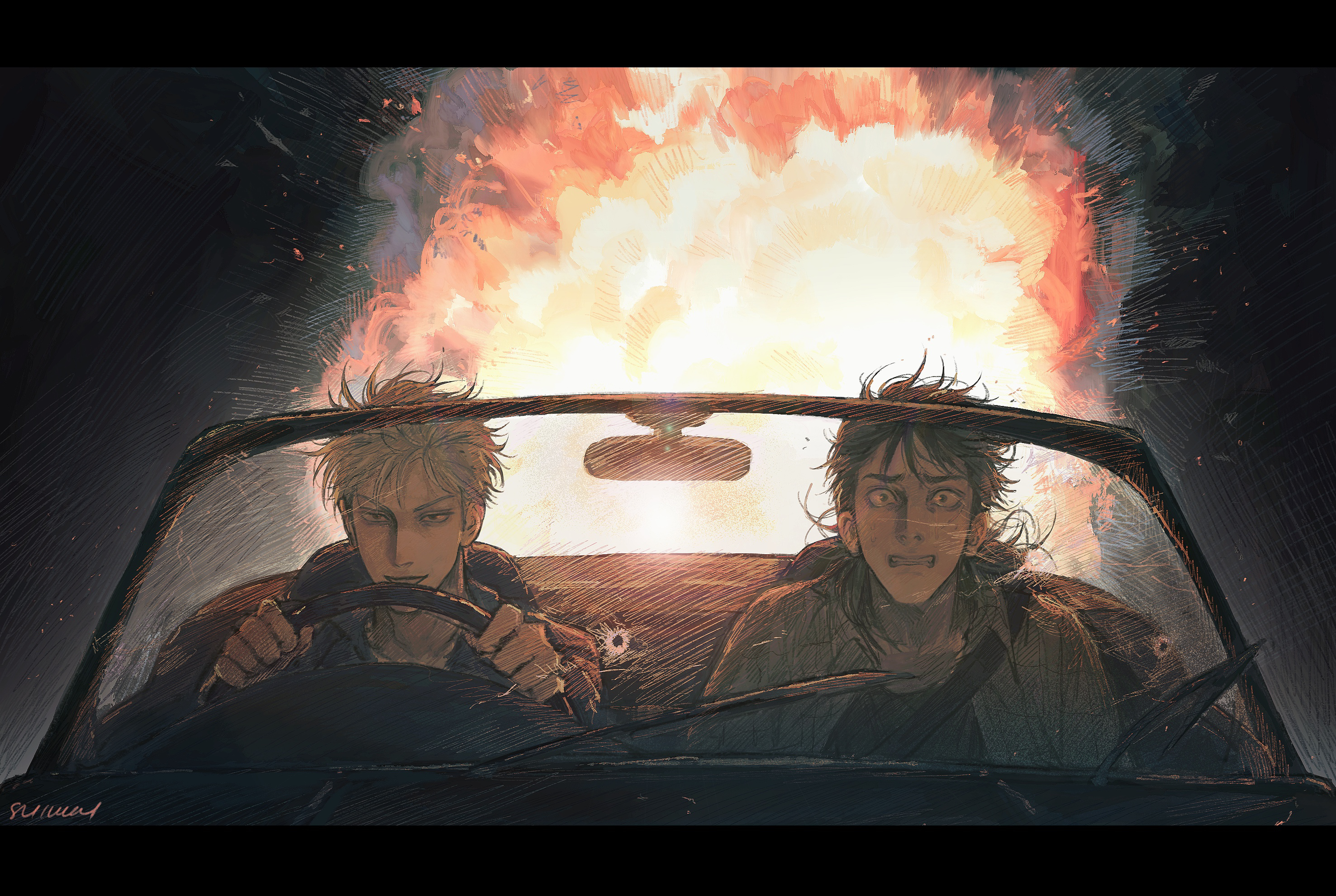 2boys akagi:_yami_ni_oritatta_tensai akagi_shigeru black_eyes black_hair bullet_hole car clenched_teeth commentary_request convertible driving explosion fire fukumoto_mahjong grey_shirt grin highres itou_kaiji tobaku_mokushiroku_kaiji letterboxed long_hair looking_at_viewer male_focus motor_vehicle multiple_boys open_clothes open_shirt right-hand_drive shiloh_815 shirt short_hair sitting smile teeth white_hair