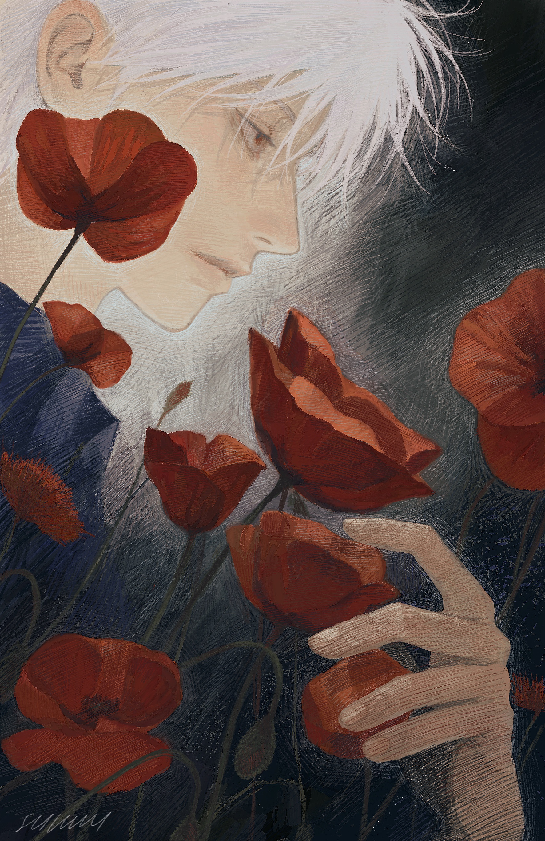 1boy absurdres akagi:_yami_ni_oritatta_tensai akagi_shigeru closed_mouth commentary_request expressionless fingernails flower fukumoto_mahjong grey_background grey_shirt hair_between_eyes highres long_bangs male_focus painterly profile red_eyes red_flower shiloh_815 shirt short_hair signature solo upper_body white_hair