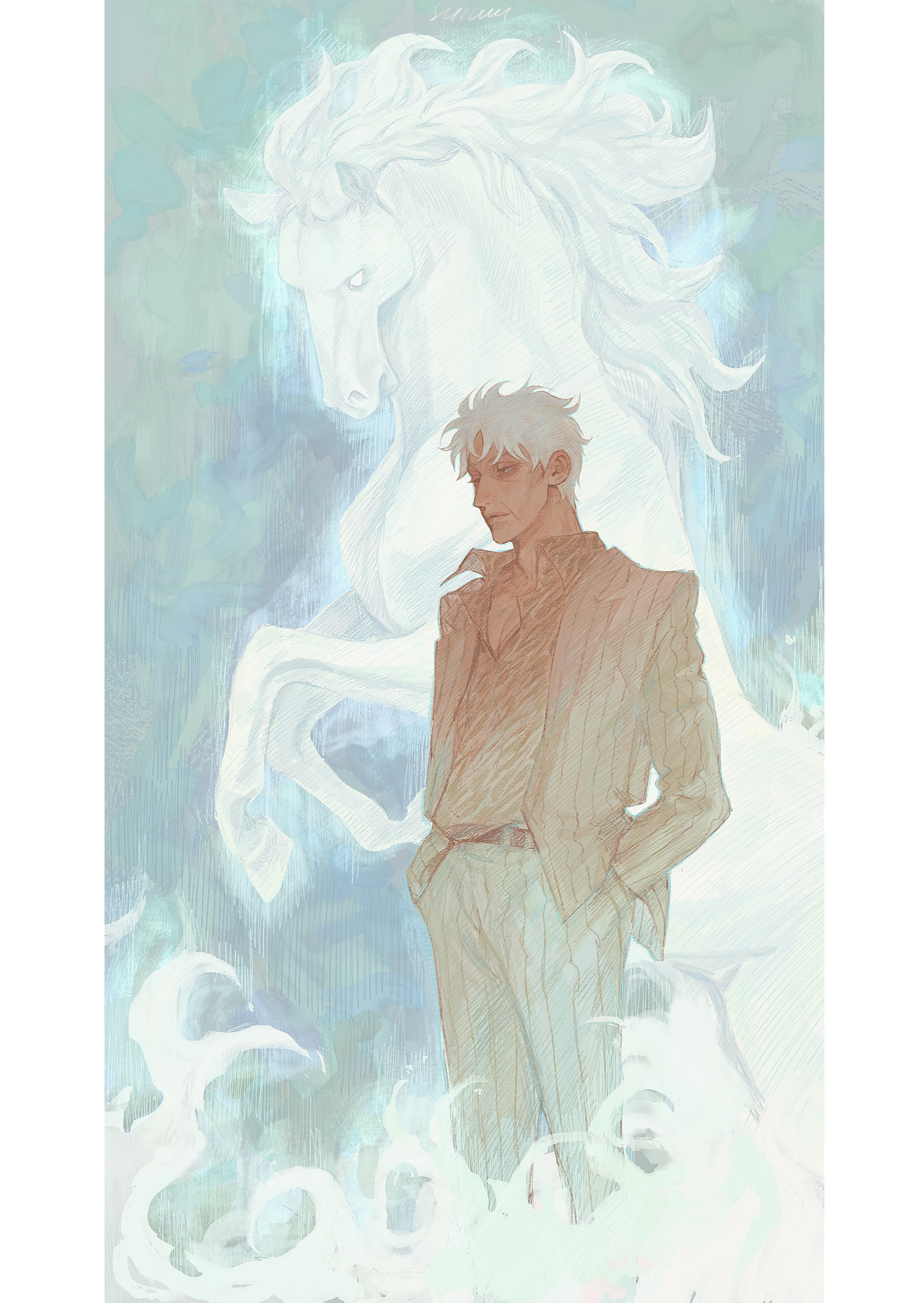 1boy absurdres akagi_shigeru animal_print belt black_belt blazer closed_mouth collared_shirt commentary_request expressionless feet_out_of_frame formal_clothes fukumoto_mahjong grey_jacket hands_in_pockets highres horse jacket looking_afar male_focus old old_man pants pillarboxed pinstripe_pattern pinstripe_suit print_shirt shiloh_815 shirt short_hair solo standing striped_clothes striped_jacket striped_pants suit ten_(manga) tiger_print vertical-striped_clothes vertical-striped_jacket vertical-striped_pants white_hair white_horse white_pants