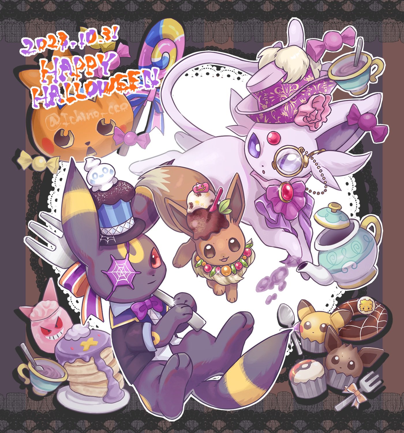 bright_pupils candy candy_wrapper clothed_pokemon commentary cup cupcake dated donut drifblim eevee espeon food fork gen_1_pokemon gen_2_pokemon gen_4_pokemon gen_5_pokemon gengar halloween happy_halloween hat highres holding holding_fork ichino_cco joltik lollipop monocle nintendo no_humans pikachu plate pokemon pokemon_(creature) purple_eyes purple_headwear teacup teapot umbreon vanillite white_pupils