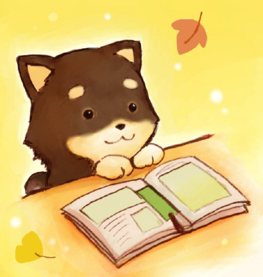 :3 animal_focus baby_animal bad_id bad_pixiv_id black_eyes book book_focus dog eijima_moko leaf no_humans original puppy