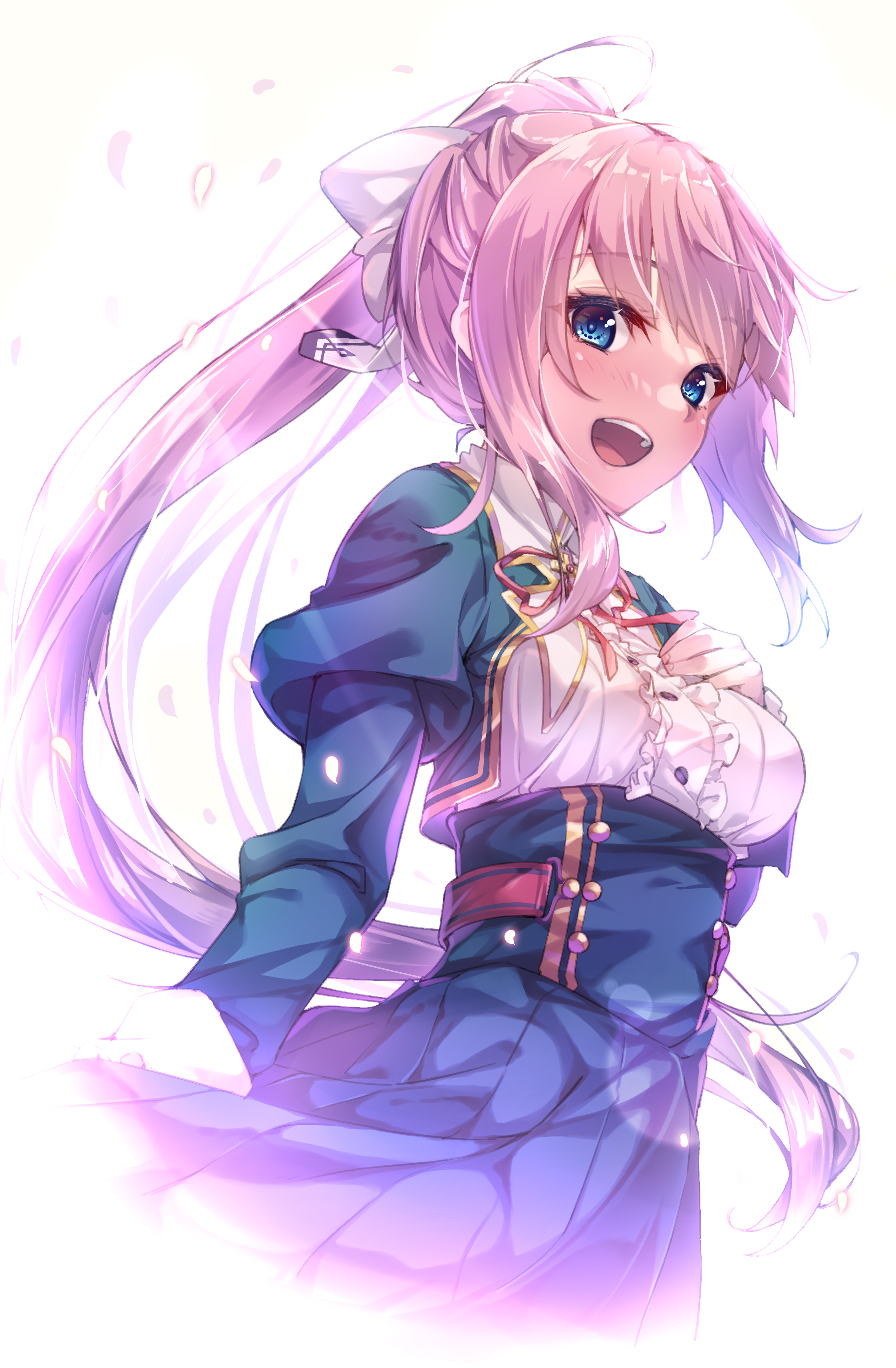 1girl :d absurdres akishisu_(air_balance) bloom blue_eyes blush bow breasts brown_hair center_frills cowboy_shot eyelashes falling_petals frills green_skirt hair_between_eyes hair_bow highres juliet_sleeves komagata_yuzuki long_hair long_sleeves looking_at_viewer medium_breasts neck_ribbon open_mouth petals pleated_skirt ponytail primal_hearts puffy_sleeves red_ribbon ribbon school_uniform shirt sidelocks simple_background skirt smile solo standing teeth upper_teeth_only very_long_hair white_background white_bow white_shirt