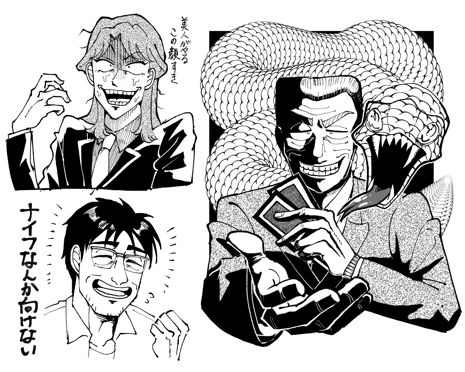 blazer card closed_eyes collared_shirt commentary_request crew_cut formal_clothes glasses greyscale grin highres holding holding_card ichijou_seiya ishida_kouji jacket tobaku_mokushiroku_kaiji long_hair long_sleeves looking_at_viewer monochrome necktie offering_hand open_mouth reaching reaching_towards_viewer satou_(ultrmngrtsrt) shirt short_hair simple_background smile snake suit swept_bangs tonegawa_yukio translation_request upper_body very_long_hair
