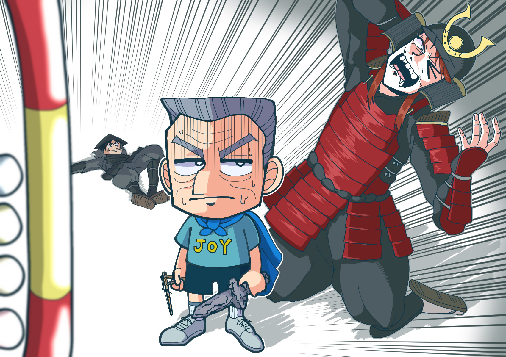 3boys alternate_costume armor black_armor black_eyes black_shorts blue_cape blue_shirt brown_hair cape chibi closed_mouth clothes_writing commentary_request crew_cut dou emphasis_lines full_body grey_footwear grey_hair hat helmet highres holding holding_sword holding_weapon ichijou_seiya japanese_armor kabuto_(helmet) tobaku_mokushiroku_kaiji kneeling kote kusazuri long_hair looking_at_another male_focus multiple_boys murakami_tamotsu one_eye_closed open_mouth parody_request red_armor rice_hat samurai satou_(ultrmngrtsrt) shirt shoes short_hair shorts shoulder_armor sneakers sode standing sword teeth tonegawa_yukio weapon