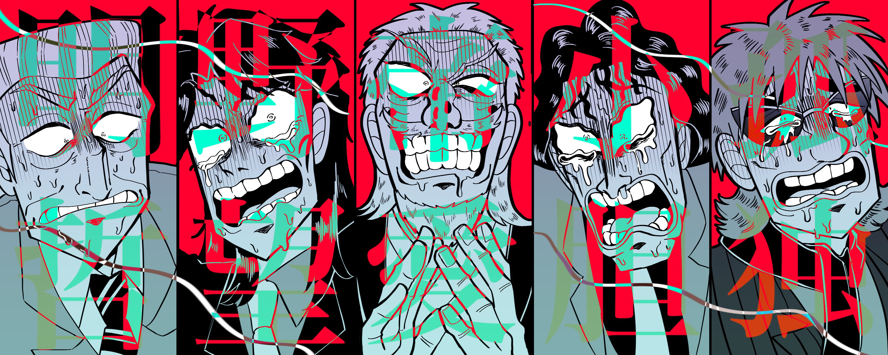 5boys asymmetrical_legwear bags_under_eyes large_nose blazer clapping collared_shirt column_lineup commentary_request crew_cut crying crying_with_eyes_open defeat fingernails flipped_hair formal_clothes fukumoto_nobuyuki_(style) greyscale_with_colored_background grin highres hyoudou_kazutaka hyoudou_kazuya ichijou_seiya jacket japanese_clothes tobaku_mokushiroku_kaiji kimono long_hair looking_at_viewer looking_down male_focus multiple_boys muraoka_takashi necktie nervous_sweating official_style old old_man open_mouth parody red_background satou_(ultrmngrtsrt) scarf shirt short_hair smile style_parody suit sunglasses surprised sweat tears teeth tonegawa_yukio translation_request uneven_legwear upper_body wavy_hair