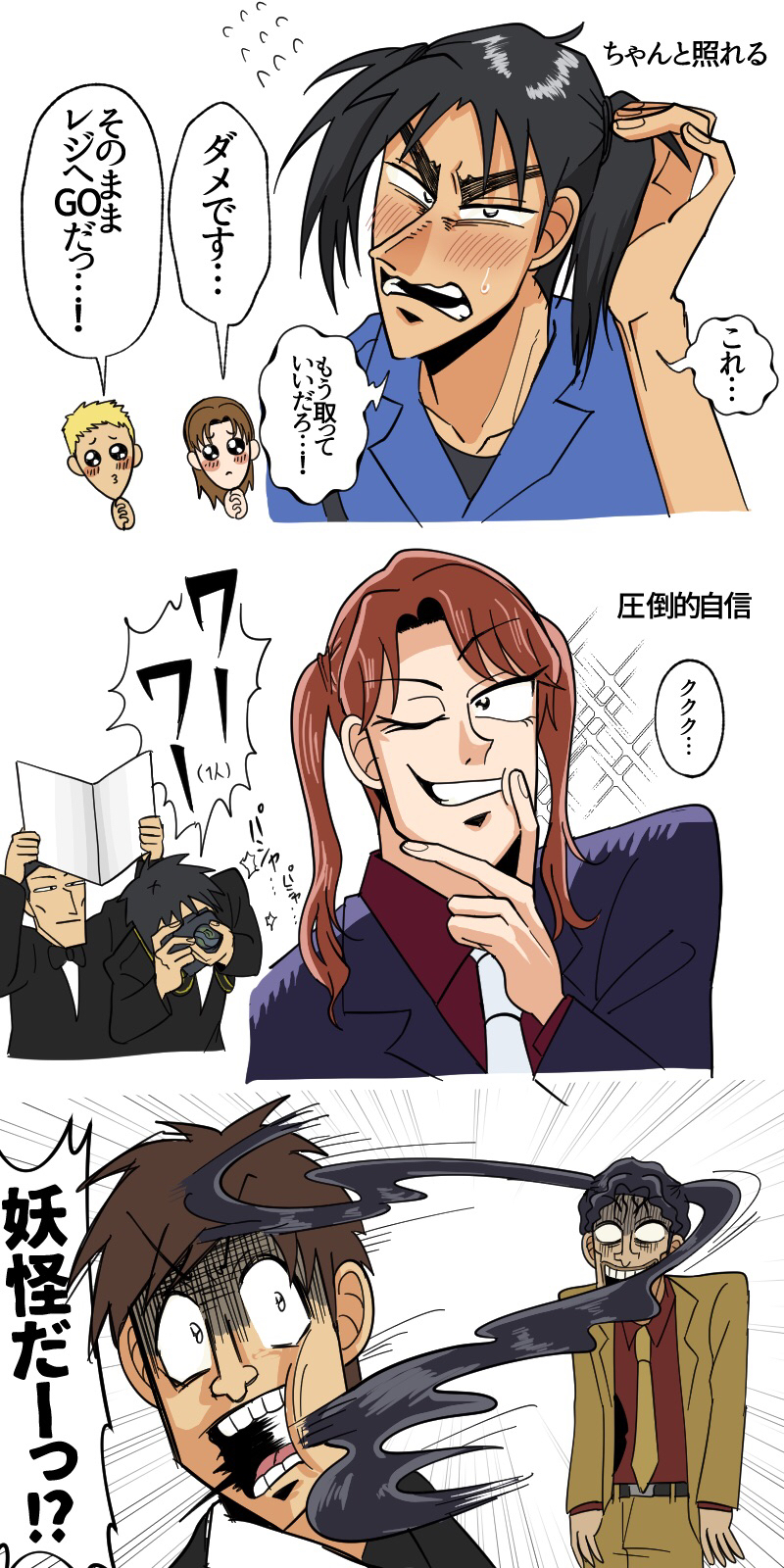 1girl 6+boys alternate_hairstyle bag large_nose black_eyes black_hair black_jacket blazer blonde_hair blue_shirt blush brown_hair brown_jacket brown_necktie brown_pants camera chibi chibi_inset collared_shirt commentary_request formal_clothes fukumoto_nobuyuki_(style) grin highres holding holding_camera ichijou_seiya itou_kaiji jacket tobaku_mokushiroku_kaiji long_hair long_sleeves male_focus miyoshi_tomohiro multiple_boys murakami_tamotsu muraoka_takashi necktie official_style one_eye_closed open_mouth pants parody pointy_nose prehensile_hair red_shirt reflector_(photography) sahara_makoto sanpaku satou_(ultrmngrtsrt) scared shirt short_bangs short_hair smile sparkle style_parody suit taking_picture translation_request twintails upper_body v-shaped_eyebrows white_background white_necktie
