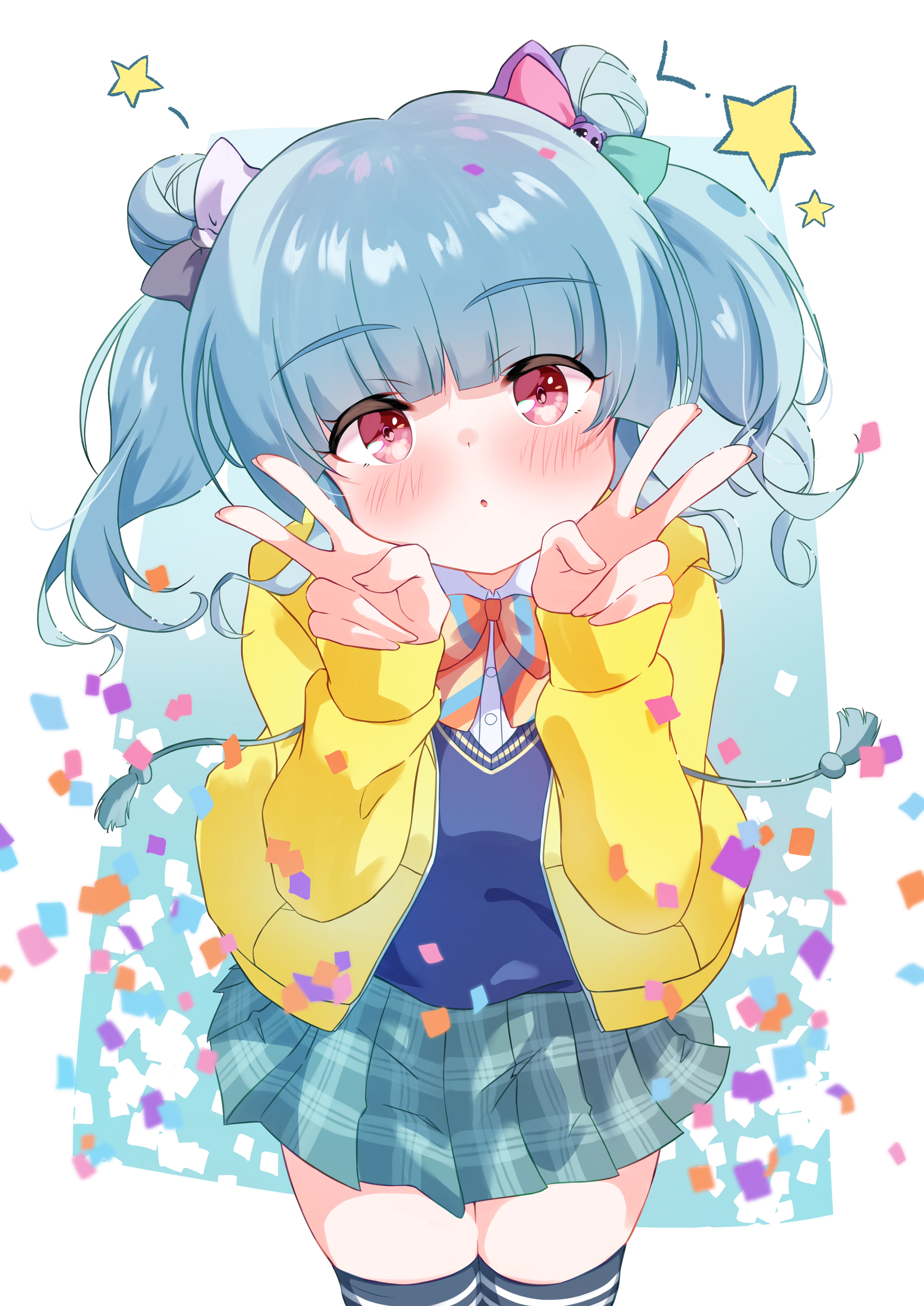 1girl :o absurdres blue_background blue_hair blue_skirt blue_sweater blue_thighhighs blunt_bangs blush border bow bowtie collared_shirt dot_nose double_v drawstring hair_bow hands_on_own_cheeks hands_on_own_face hands_up head_tilt highres hood hood_down hooded_jacket hyodou_shizuku idoly_pride jacket legs_together long_hair looking_at_viewer open_clothes open_jacket orange_bow orange_bowtie outside_border parted_lips plaid_clothes plaid_skirt pleated_skirt purin_(user_mrsf8772) red_eyes school_uniform shirt short_twintails simple_background skirt solo star_(symbol) striped_bow striped_bowtie striped_clothes sweater thighhighs thighs twintails v v-neck white_border white_shirt yellow_jacket zettai_ryouiki