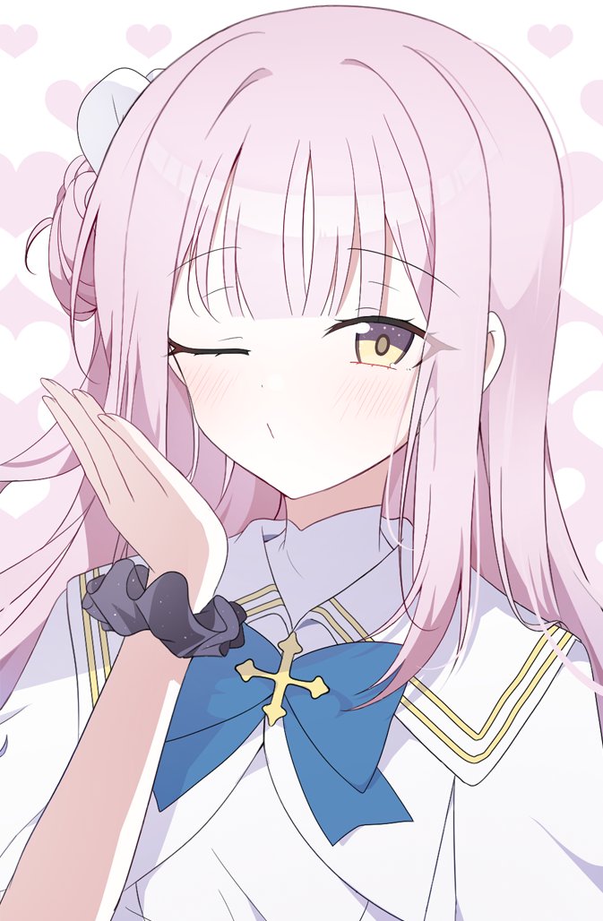 1girl blue_archive blush capelet dress hair_bun heart long_hair looking_at_viewer mika_(blue_archive) one_eye_closed pink_hair seno_(senohime) side_up_bun single_side_bun solo upper_body white_capelet white_dress yellow_eyes