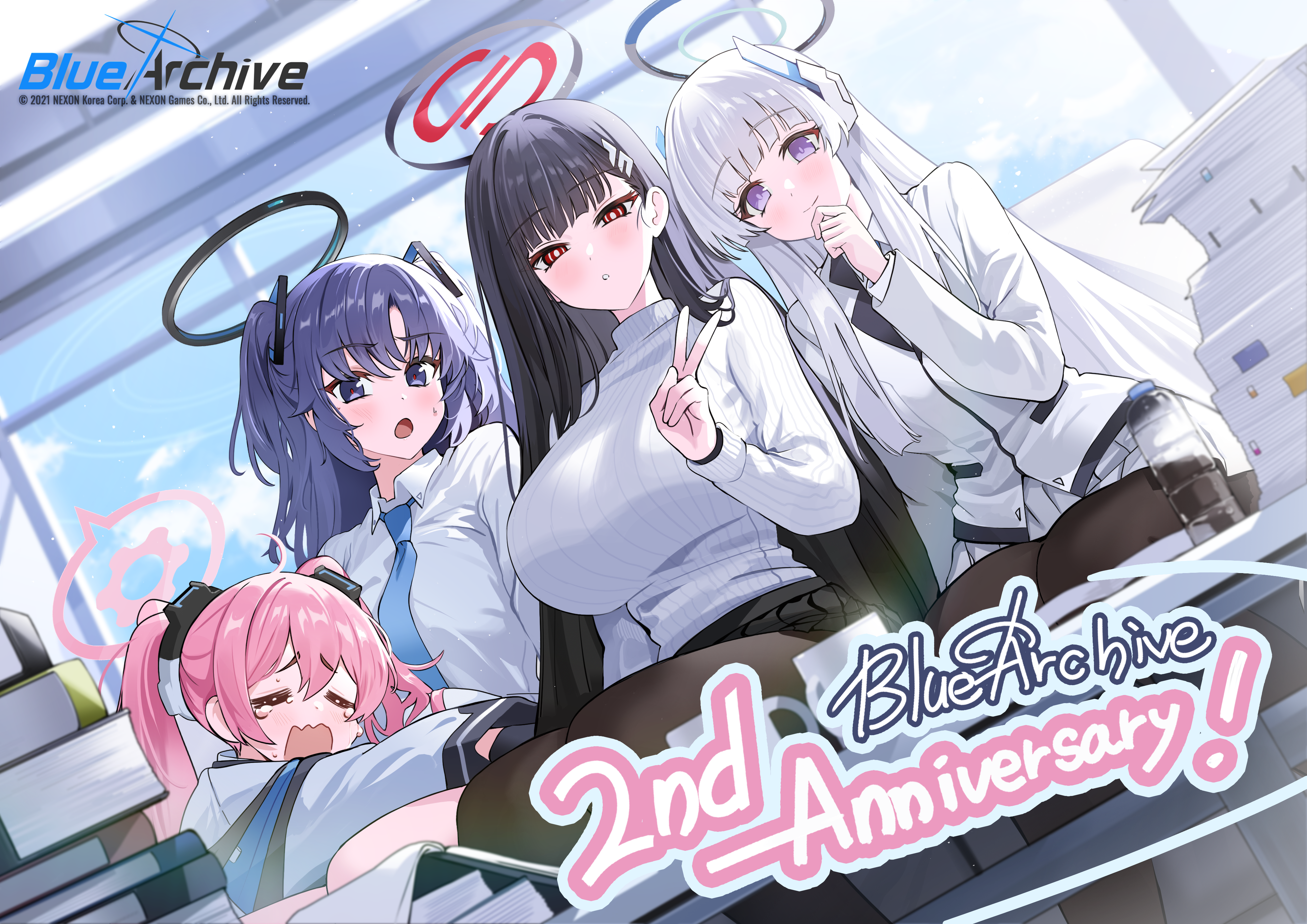 4girls absurdres anniversary black_hair black_pantyhose blue_archive blush book book_stack breasts closed_eyes cloud collared_shirt copyright_name day halo highres huge_breasts indoors jacket koyuki_(blue_archive) large_breasts logo long_hair long_sleeves looking_at_viewer medium_breasts multiple_girls noa_(blue_archive) official_art open_mouth pantyhose paper paper_stack parted_lips pink_hair red_eyes ribbed_sweater rio_(blue_archive) school_uniform seminar_(blue_archive) shirt sitting sky smile sweater tears turtleneck turtleneck_sweater twintails two_side_up v white_hair white_shirt white_sweater yuki_(asayuki101) yuuka_(blue_archive)