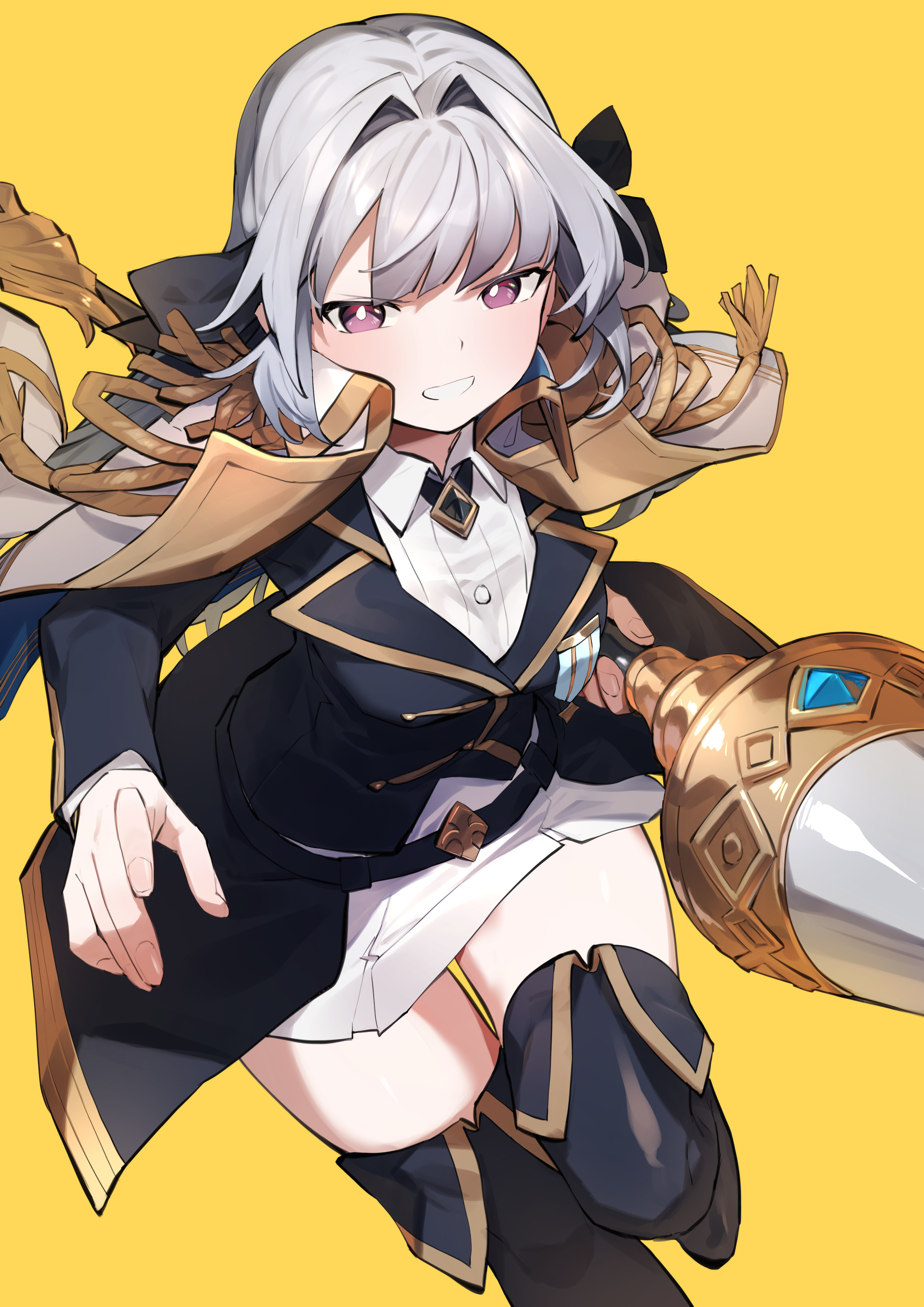 1girl absurdres belt black_belt black_boots black_gem black_jacket black_ribbon blue_gem boots breasts bright_pupils buttons collared_shirt epaulettes fingernails foot_out_of_frame gem goe_(g-o-e) grey_hair grin hair_intakes hair_ribbon hands_up highres holding holding_polearm holding_weapon jacket jacket_on_shoulders lance large_breasts leg_up long_hair long_sleeves looking_at_viewer medal miniskirt neck_ribbon parted_lips polearm purple_eyes ribbon shirt shoujo_kageki_revue_starlight shoujo_kageki_revue_starlight_-re_live- simple_background skirt smile solo standing standing_on_one_leg thigh_boots thigh_gap thighhighs v-shaped_eyebrows waist_cape weapon white_jacket white_pupils white_shirt white_skirt yellow_background yukishiro_akira zettai_ryouiki