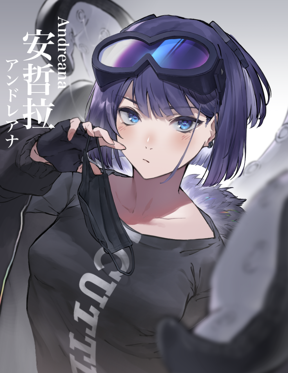 1girl andreana_(arknights) arknights black_gloves black_shirt blue_eyes blush breasts character_name chikoku_no_oni clothes_writing earrings fingerless_gloves fur_trim gloves goggles goggles_on_head grey_background highres jewelry looking_at_viewer mask mouth_mask purple_hair shirt short_hair simple_background small_breasts solo tentacles unworn_mask upper_body