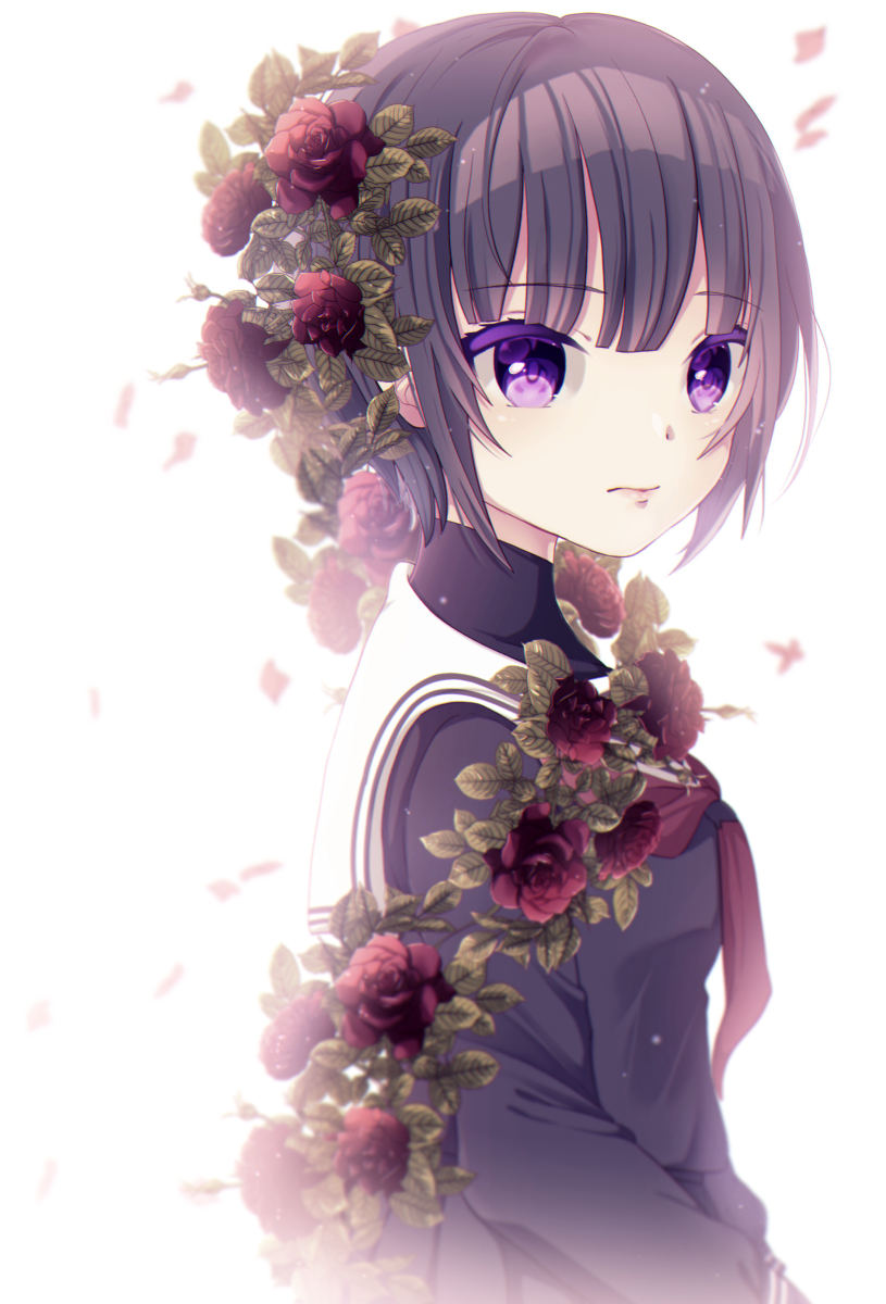 1girl black_hair black_shirt falling_petals flower hair_flower hair_ornament highres idolmaster idolmaster_cinderella_girls looking_at_viewer looking_to_the_side neckerchief nikoneko petals purple_eyes red_neckerchief school_uniform serafuku shirayuki_chiyo shirt short_hair simple_background solo upper_body white_background yahagi_(yui1251)