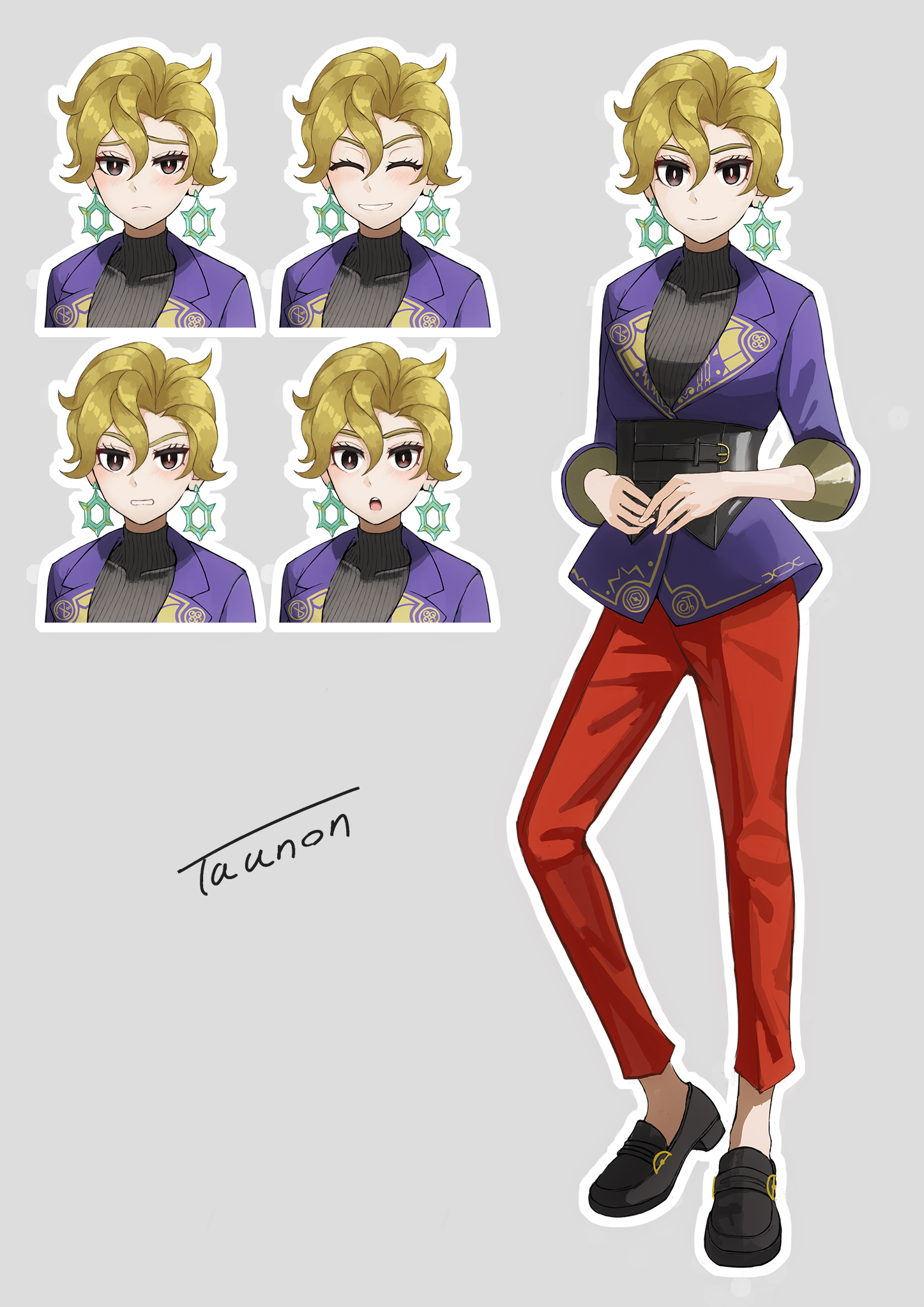 1girl black_footwear blonde_hair briar_(pokemon) bright_pupils brown_eyes closed_mouth commentary_request earrings eyelashes grey_background hair_between_eyes highres jacket jewelry multiple_expressions multiple_views nintendo no_socks outline pants pokemon pokemon_scarlet_and_violet purple_jacket red_pants ribbed_shirt shirt shoes short_hair signature smile tau_(tau_1111) three-quarter_sleeves white_pupils