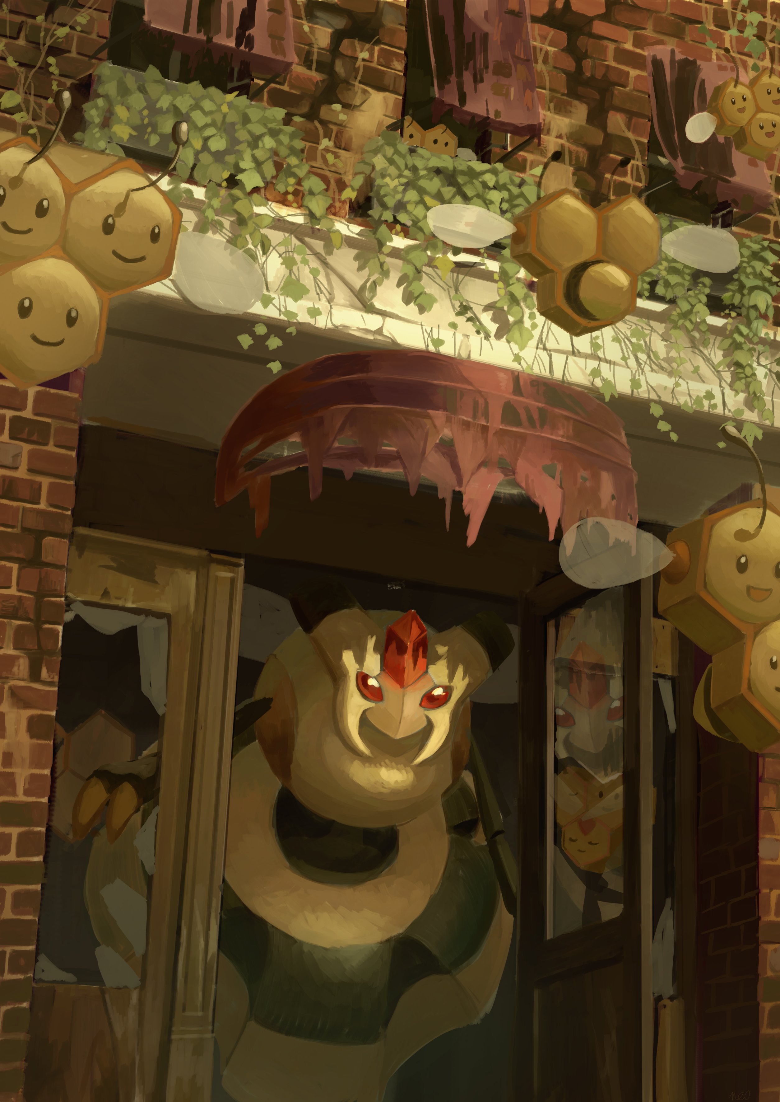 absurdres brick_wall broken_window building closed_mouth combee commentary_request evolutionary_line flying gen_4_pokemon highres king_joe_(neoroto) nintendo no_humans plant pokemon pokemon_(creature) red_eyes reflection smile vespiquen vines