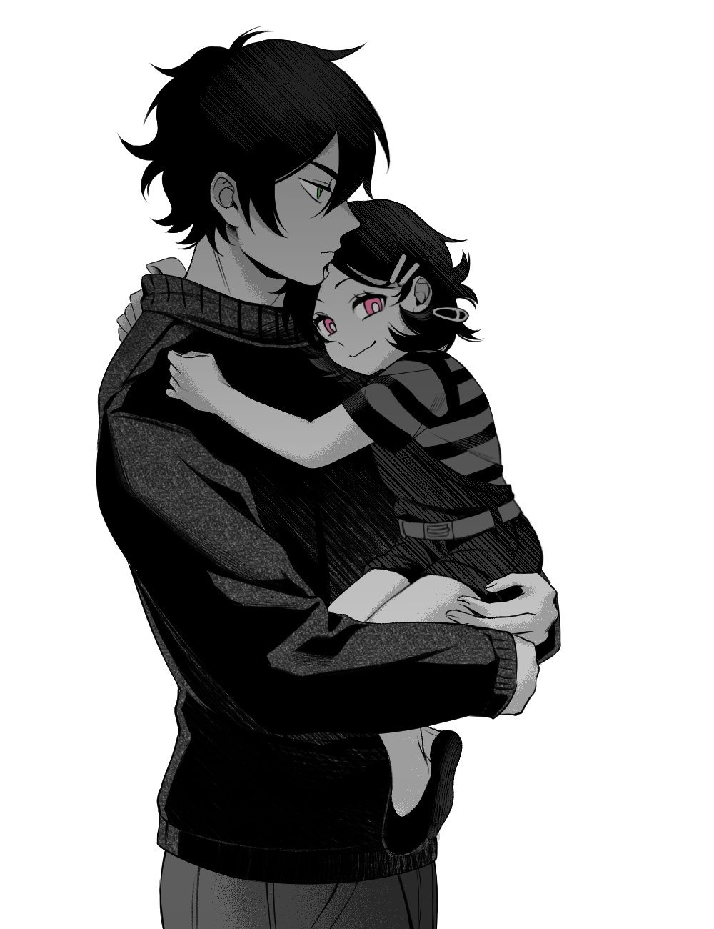 1boy 1girl :3 age_difference aged_down andrew_graves_(the_coffin_of_andy_and_leyley) ashley_graves black_hair black_sweater carrying child green_eyes highres official_alternate_costume pink_eyes renico shorts smile smug sweater the_coffin_of_andy_and_leyley white_background