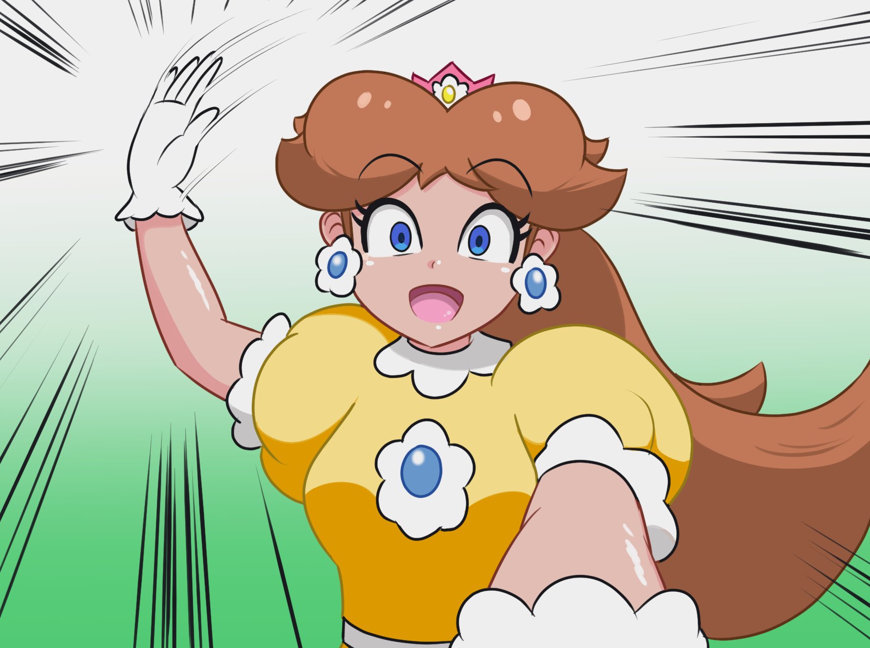 1girl annoyed blue_eyes brooch brown_hair crown earrings flower_earrings gloves hand_up highres jewelry kirihoshi long_hair looking_at_viewer mario_(series) mario_party mario_party_3 nintendo open_mouth princess_daisy puffy_short_sleeves puffy_sleeves shiny_skin short_sleeves slapping upper_body