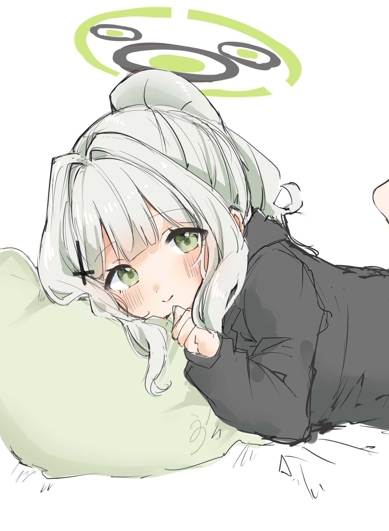 1girl black_hoodie blue_archive blush closed_mouth cross_hair_ornament green_eyes green_halo grey_hair hair_ornament halo hare_(blue_archive) highres hood hoodie long_hair long_sleeves looking_at_viewer ponytail simple_background solo unot_227 upper_body white_background