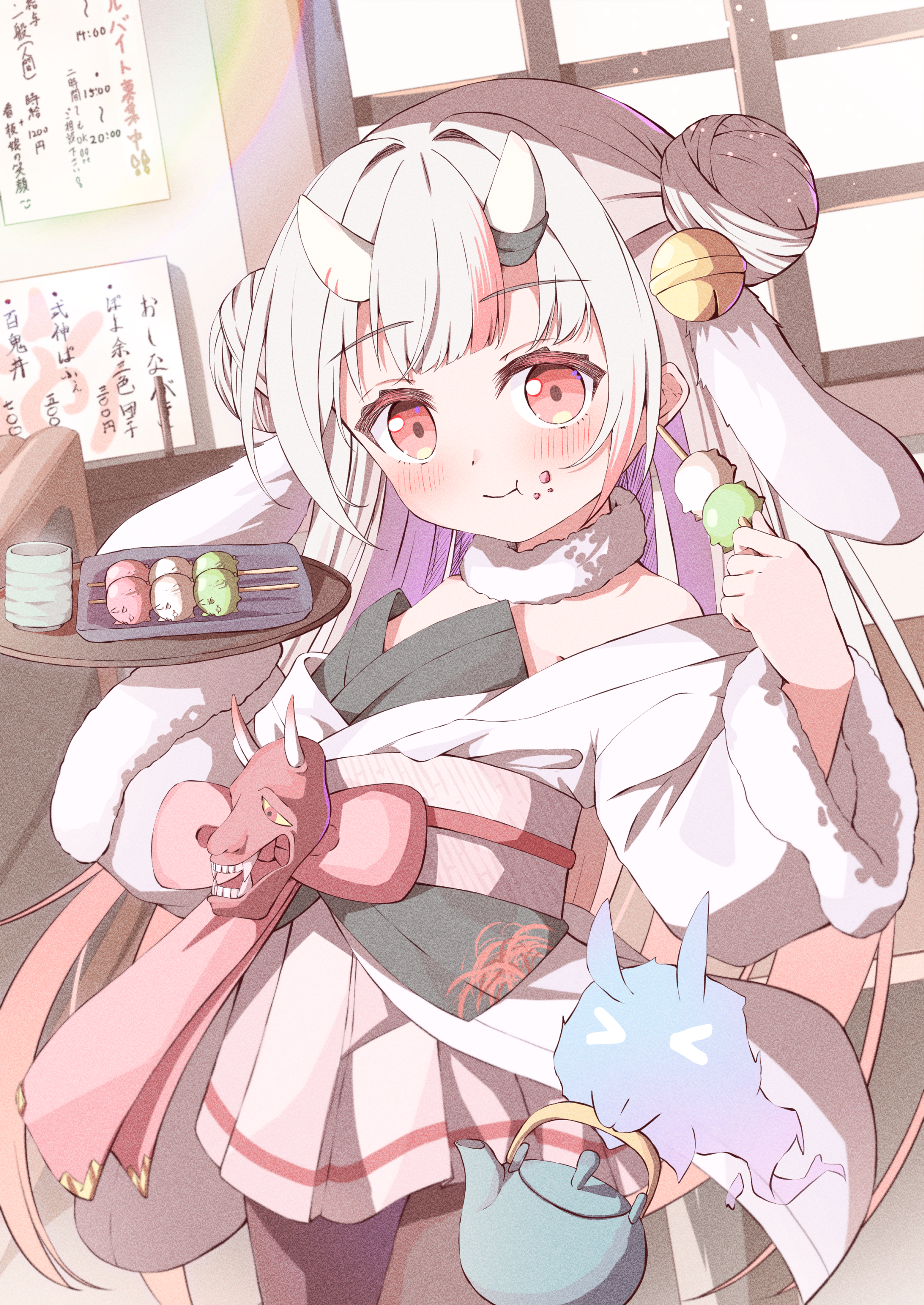 1girl absurdres animal_ears bell black_panties blush blush_stickers closed_mouth commentary_request cup double_bun fake_animal_ears fang food food_on_face fur-trimmed_sleeves fur_choker fur_trim ghost gradient_hair grey_hair hair_bun highres holding holding_tray hololive horns japanese_clothes jingle_bell kimono kyouwashi long_hair long_sleeves looking_at_viewer lop_rabbit_ears miniskirt mochi multicolored_hair nakiri_ayame obi off_shoulder panties pink_skirt pleated_skirt rabbit_ears red_eyes red_hair sash shiranui_(nakiri_ayame) side_up_bun skin-covered_horns skirt smile solo_focus streaked_hair teapot tray two_side_up underwear virtual_youtuber wide_sleeves yunomi