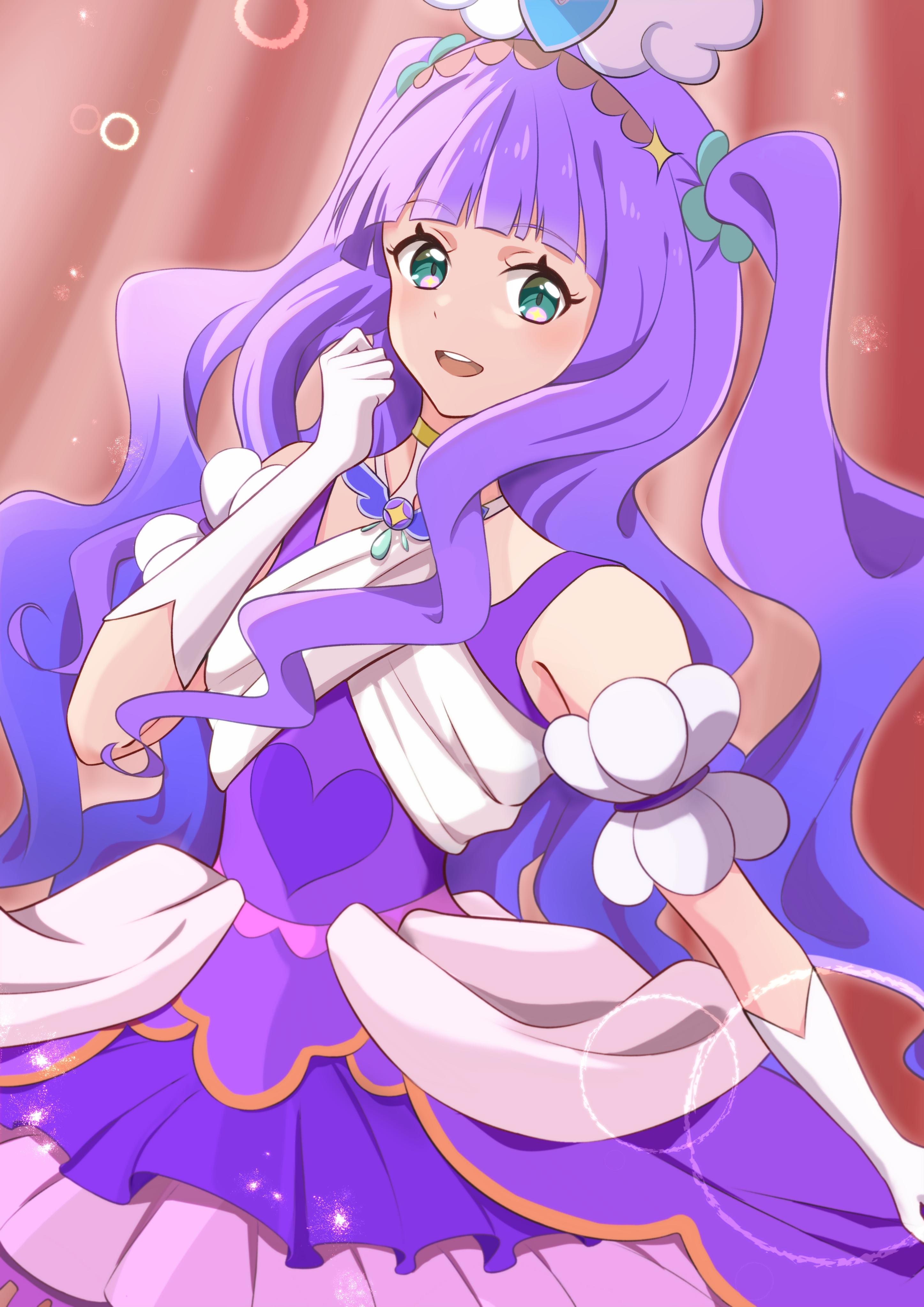 1girl absurdres aqua_eyes brooch cure_majesty dress elbow_gloves ellee-chan gloves hair_ornament highres hirogaru_sky!_precure jewelry long_hair looking_at_viewer magical_girl open_mouth precure purple_dress purple_hair smile solo standing tenma_no_atelier two_side_up very_long_hair white_gloves wing_brooch wing_hair_ornament