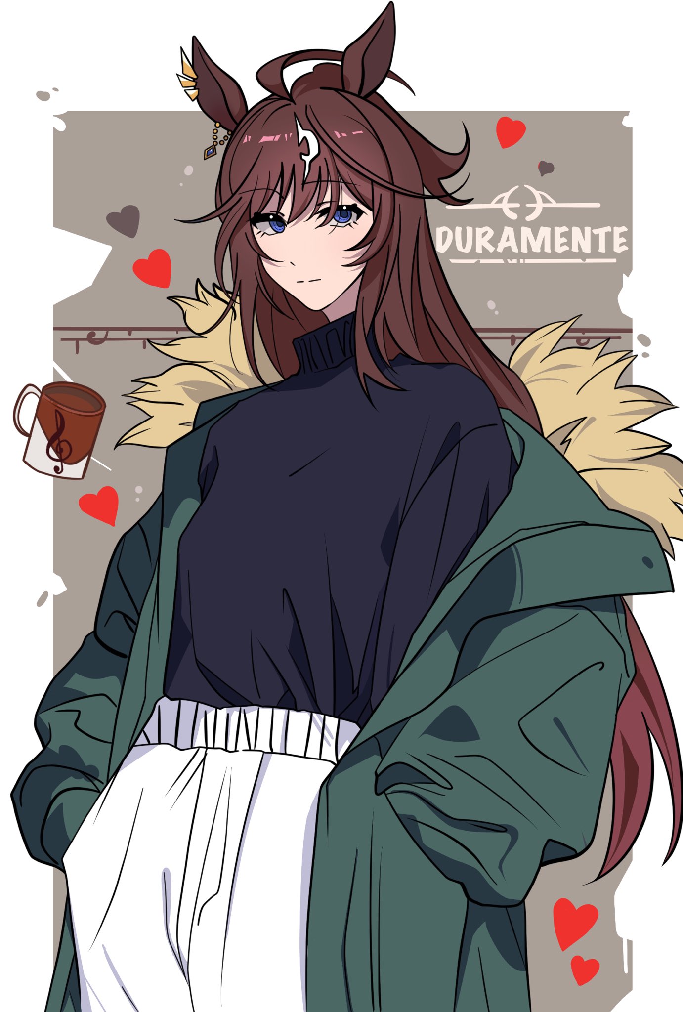 1girl ahoge alternate_costume animal_ears black_shirt blue_eyes brown_hair casual character_name closed_mouth coat cowboy_shot cup disposable_cup duramente_(umamusume) fur-trimmed_coat fur_trim green_coat hands_in_own_hair heart highres horse_ears kukmmo long_hair long_sleeves looking_at_viewer mug multicolored_hair open_clothes open_coat pants shirt shirt_tucked_in solo streaked_hair turtleneck umamusume white_pants