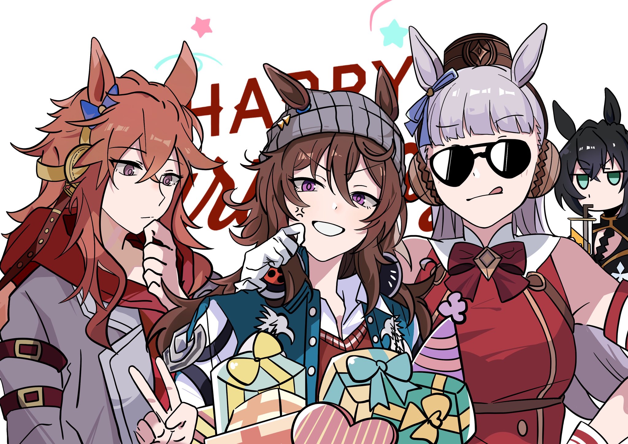 4girls anger_vein armband bow bowtie box breasts brown_hair brown_headwear cheek_pinching closed_mouth collared_shirt dress ears_through_headwear facing_viewer false_smile gift gift_box glasses gold_ship_(red_strife)_(umamusume) gold_ship_(umamusume) green_eyes grey_hair grey_headwear grey_jacket hand_on_own_chin happy_birthday hat highres jacket jitome kin'iro_ryotei_(umamusume) kukmmo long_hair looking_at_viewer medium_breasts multiple_girls nakayama_festa_(umamusume) opaque_glasses open_clothes open_jacket orfevre_(old_design)_(umamusume) pinching purple_eyes red_dress red_hood red_sweater shirt sleeveless sleeveless_dress smile star_(symbol) stroking_own_chin sunglasses sweater sweater_vest tongue tongue_out umamusume upper_body v white_shirt