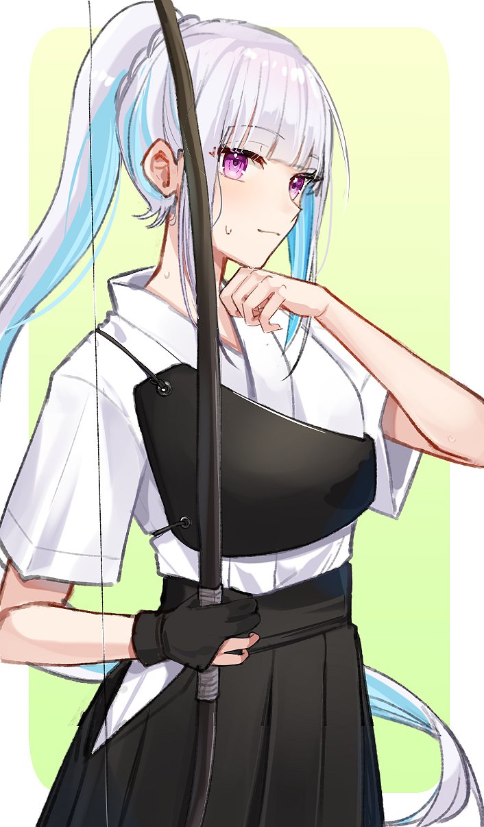 1girl aqua_hair archery black_skirt blunt_bangs bow_(weapon) colored_inner_hair commentary gloves hakama hakama_skirt highres holding holding_bow_(weapon) holding_weapon japanese_clothes kyuudou lize_helesta multicolored_hair muneate nijisanji partially_fingerless_gloves partly_fingerless_gloves ponytail purple_eyes sidelocks skirt solo untranslatable_commentary virtual_youtuber weapon white_hair wiping_sweat yugake zyenokana