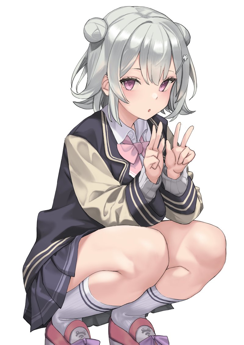 1girl :o akahara_tyun black_jacket black_skirt bow bowtie brown_sleeves cardigan cevio collared_shirt double-parted_bangs double_bun foot_out_of_frame footwear_bow grey_cardigan grey_hair hair_between_eyes hair_bun hair_ornament hairclip jacket koharu_rikka letterman_jacket long_sleeves pink_bow pink_bowtie pink_shoes pleated_skirt puffy_long_sleeves puffy_sleeves purple_bow purple_hair school_uniform shirt shoes short_hair simple_background skirt socks solo squatting synthesizer_v white_background white_shirt white_socks