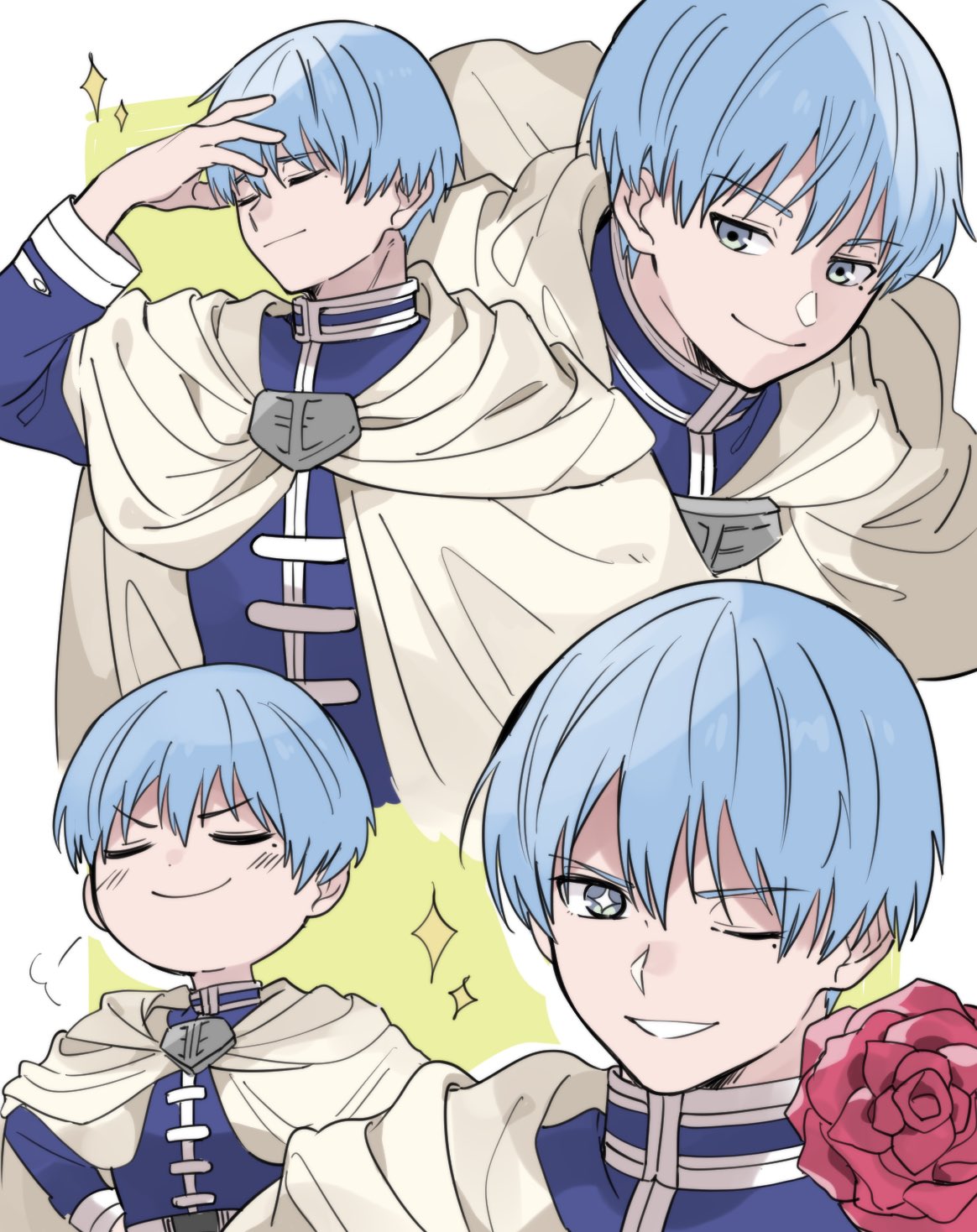 1boy puff_of_air blue_eyes blue_hair blue_shirt brooch cloak closed_eyes closed_mouth commentary_request facing_viewer flower hair_between_eyes hand_on_own_face hand_up highres himmel_(sousou_no_frieren) hood hooded_cloak jewelry long_sleeves looking_at_viewer male_focus mole mole_under_eye multiple_views one_eye_closed open_mouth poteke red_flower red_rose rose shirt short_hair smile sousou_no_frieren sparkle upper_body white_cloak