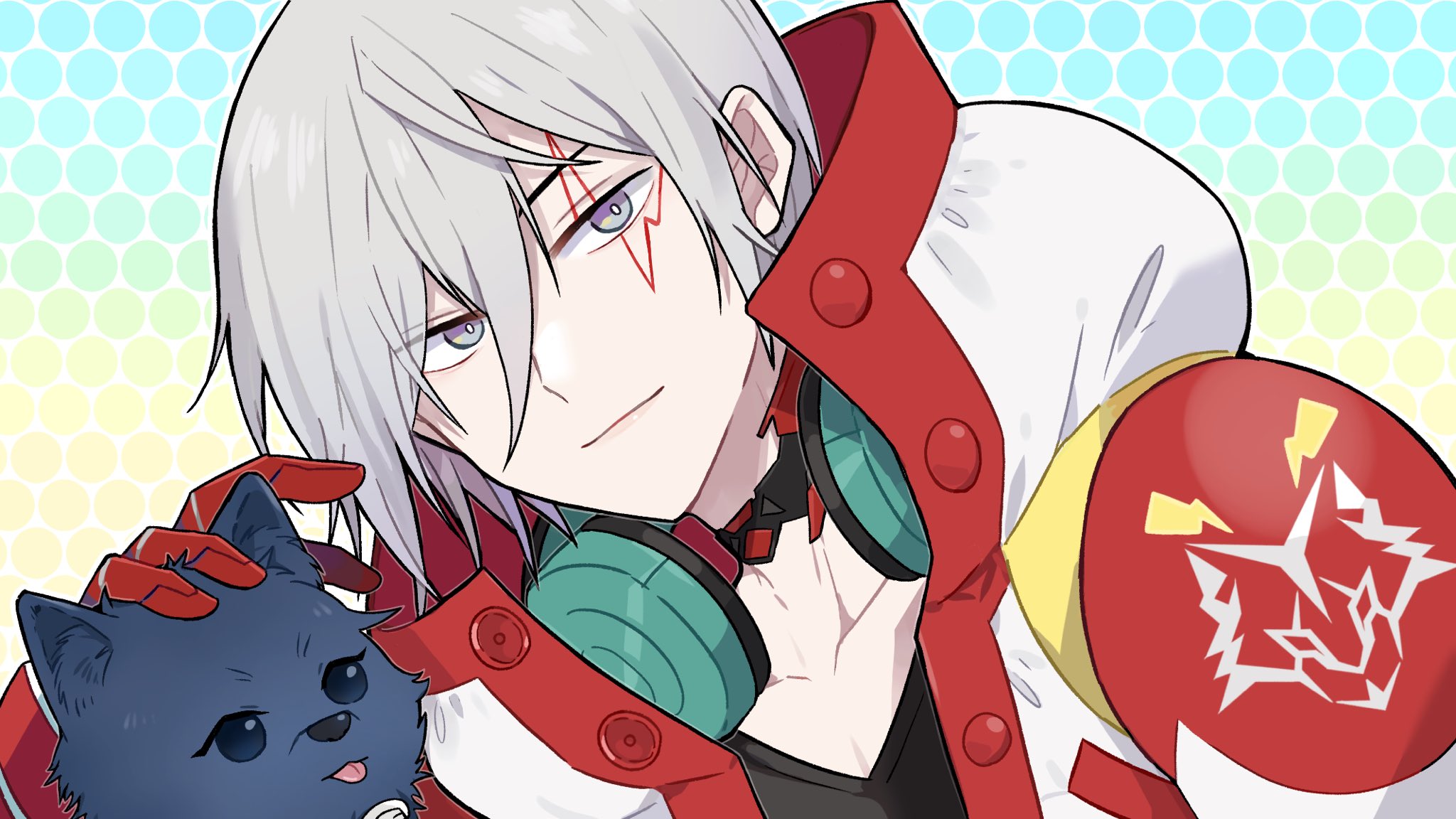 1boy dog facial_tattoo fulgur_ovid gloves grey_eyes grey_hair hair_between_eyes headphones headphones_around_neck highres jacket land_(freeondeland) male_focus nijisanji nijisanji_en red_gloves solo tattoo v-neck virtual_youtuber white_jacket