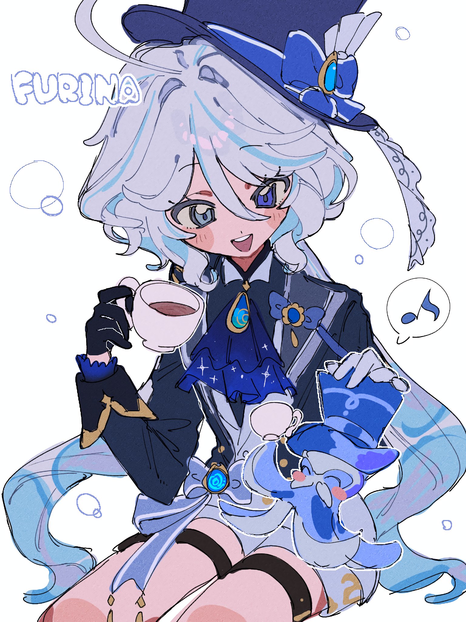 1girl :d ahoge ascot asymmetrical_gloves black_gloves black_jacket blue_ascot blue_eyes blue_gem blue_hair blue_hat blue_ribbon blue_sash blush brooch character_name commentary_request cowboy_shot cup frilled_ascot frills furina_(genshin_impact) gem genshin_impact gloves grey_hair hair_between_eyes hat hat_ribbon heterochromia highres holding holding_cup jacket jewelry long_hair low_ponytail mismatched_gloves multicolored_hair musical_note octopus open_clothes open_jacket open_mouth ponytail ribbon sash shorts simple_background sitting sleeve_cuffs smile solo sparkle split_ponytail spoken_musical_note streaked_hair teacup teeth ten_(ugoki_tennen48) thigh_strap top_hat upper_teeth_only very_long_hair waist_sash wavy_hair white_background white_gloves white_shorts
