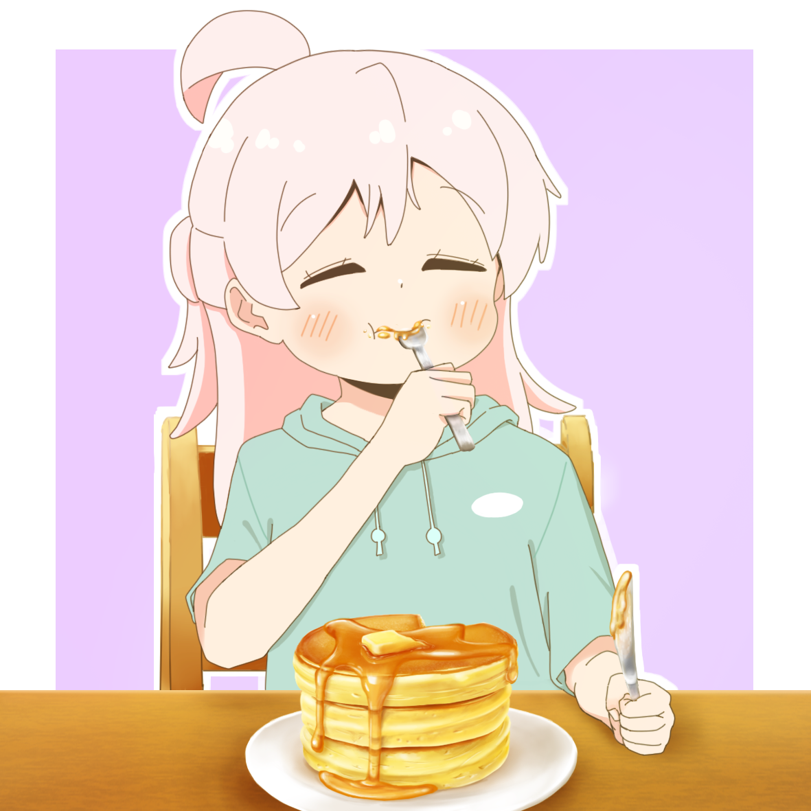 1girl ahoge blush butter butterknife closed_eyes closed_mouth dot_nose eating food fork genderswap genderswap_(mtf) holding holding_fork holding_knife hood hoodie knife long_hair onii-chan_wa_oshimai! oyama_mahiro pancake plate short_sleeves sitting solo syrup zaki_oym