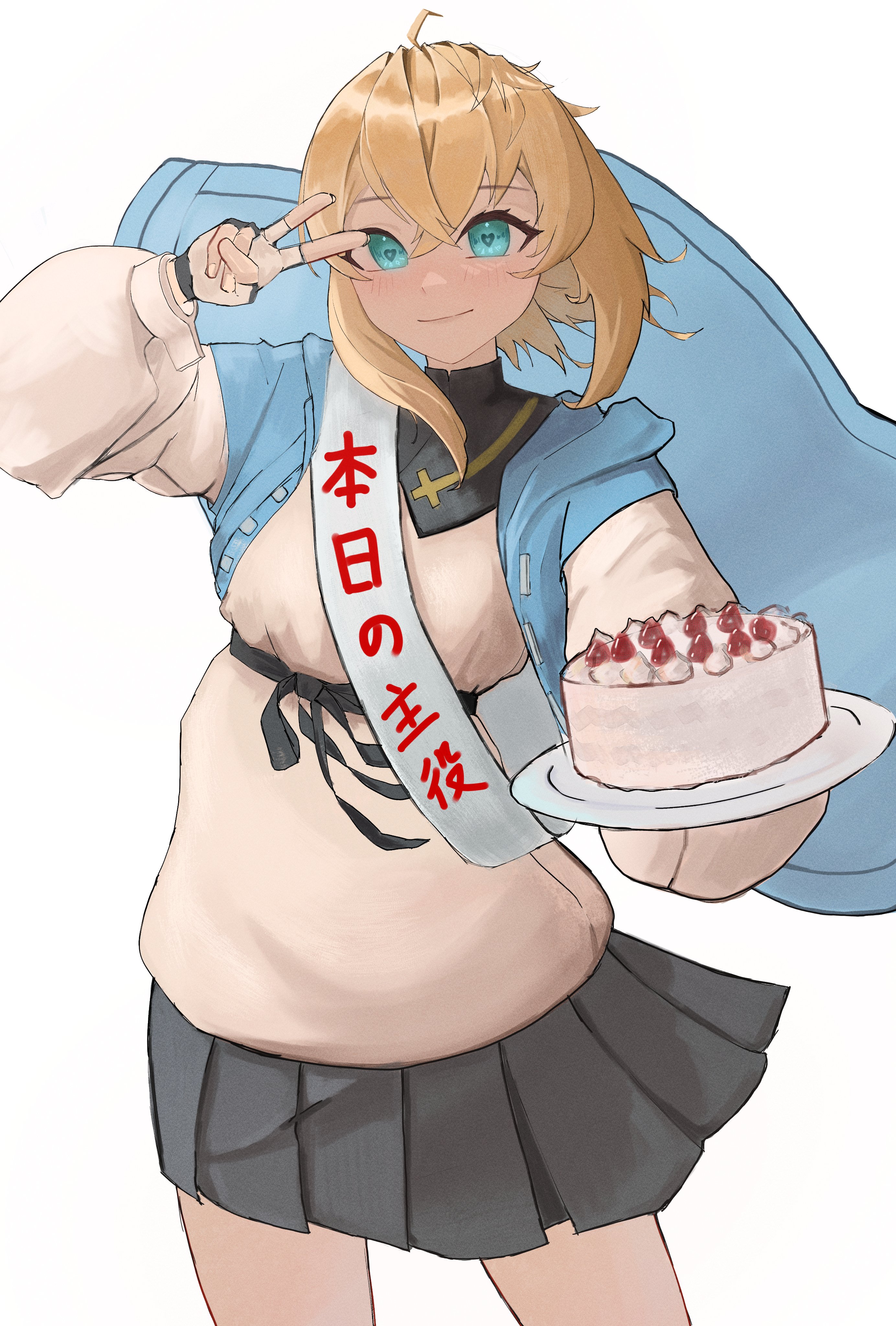 1boy absurdres birthday_cake black_gloves blonde_hair blush bridget_(guilty_gear) cake fingerless_gloves food gloves grey_skirt guilty_gear guilty_gear_strive heart heart-shaped_pupils highres holding holding_cake holding_food holding_plate hood hood_down hooded_jacket hoodie jacket kurutontyan long_sleeves looking_at_viewer male_focus medium_hair open_clothes open_hoodie plate pleated_skirt skirt smile solo symbol-shaped_pupils trap v