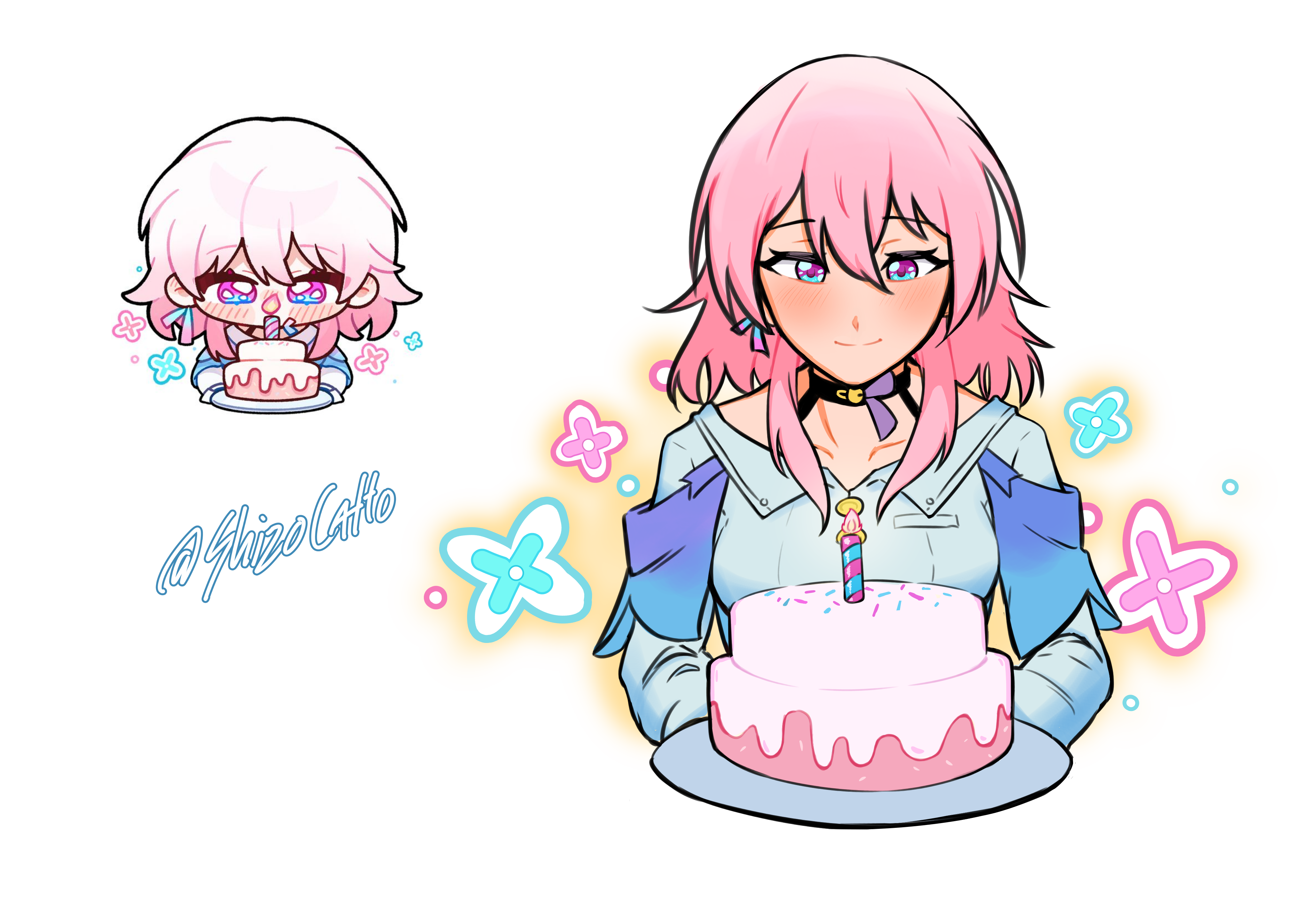 1girl absurdres artist_name birthday_cake black_choker blue_eyes blue_jacket blush breasts buttons cake choker closed_mouth commentary cropped_torso dress_shirt earrings english_commentary food highres honkai:_star_rail hoyolab_sticker_redraw honkai_(series) jacket jewelry long_sleeves march_7th_(honkai:_star_rail) march_7th_(preservation)_(honkai:_star_rail) medium_breasts medium_hair multicolored_eyes pink_eyes pink_hair shirt shizocatto single_earring smile solo two-tone_eyes white_background white_shirt