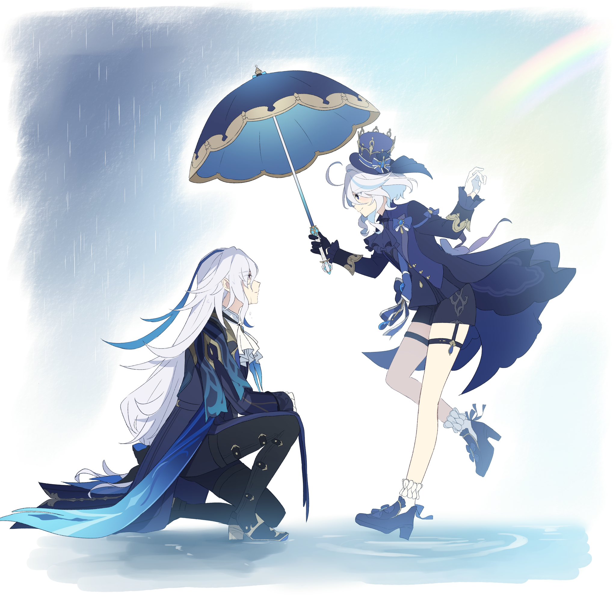 1boy 1girl ahoge ascot asymmetrical_gloves black_bow black_footwear black_gloves black_pants black_shorts blue_ascot blue_bow blue_coat blue_eyes blue_footwear blue_gem blue_hair blue_headwear blue_jacket blue_sky blue_umbrella blush boots bow closed_mouth cloud coat commentary eye_contact eyelashes frilled_sleeves frills furina_(genshin_impact) gem genshin_impact gloves hair_between_eyes hair_bow hair_intakes hands_up hat hat_bow high_heels highres holding holding_umbrella jacket kneeling leg_up long_hair long_sleeves looking_at_another low-tied_long_hair mismatched_gloves multicolored_hair neuvillette_(genshin_impact) on_one_knee overcast pants profile purple_eyes rain rainbow shirase_(shirose) short_hair shorts sidelocks simple_background sky sleeve_cuffs smile socks streaked_hair thigh_strap tilted_headwear top_hat umbrella very_long_hair water wet wet_hair white_ascot white_background white_gloves white_hair white_socks