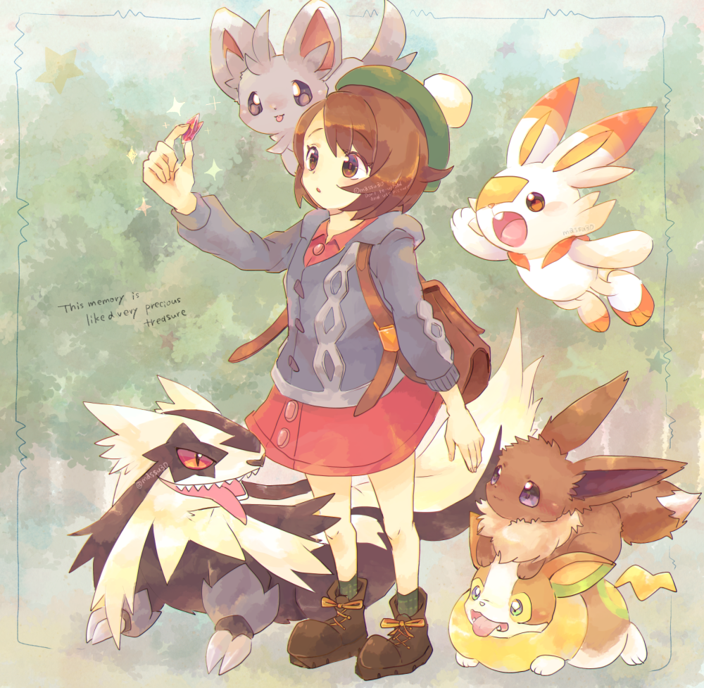 1girl backpack bag bob_cut boots brown_bag brown_eyes brown_footwear brown_hair buttons cable_knit cardigan collared_dress commentary_request dress eevee galarian_form galarian_linoone gen_1_pokemon gen_5_pokemon gen_8_pokemon gloria_(pokemon) green_headwear green_socks grey_cardigan hat holding hood hooded_cardigan knees minccino nintendo parted_lips pink_dress pokemon pokemon_(creature) pokemon_sword_and_shield roamo scorbunny short_hair socks sparkle standing tam_o'_shanter yamper