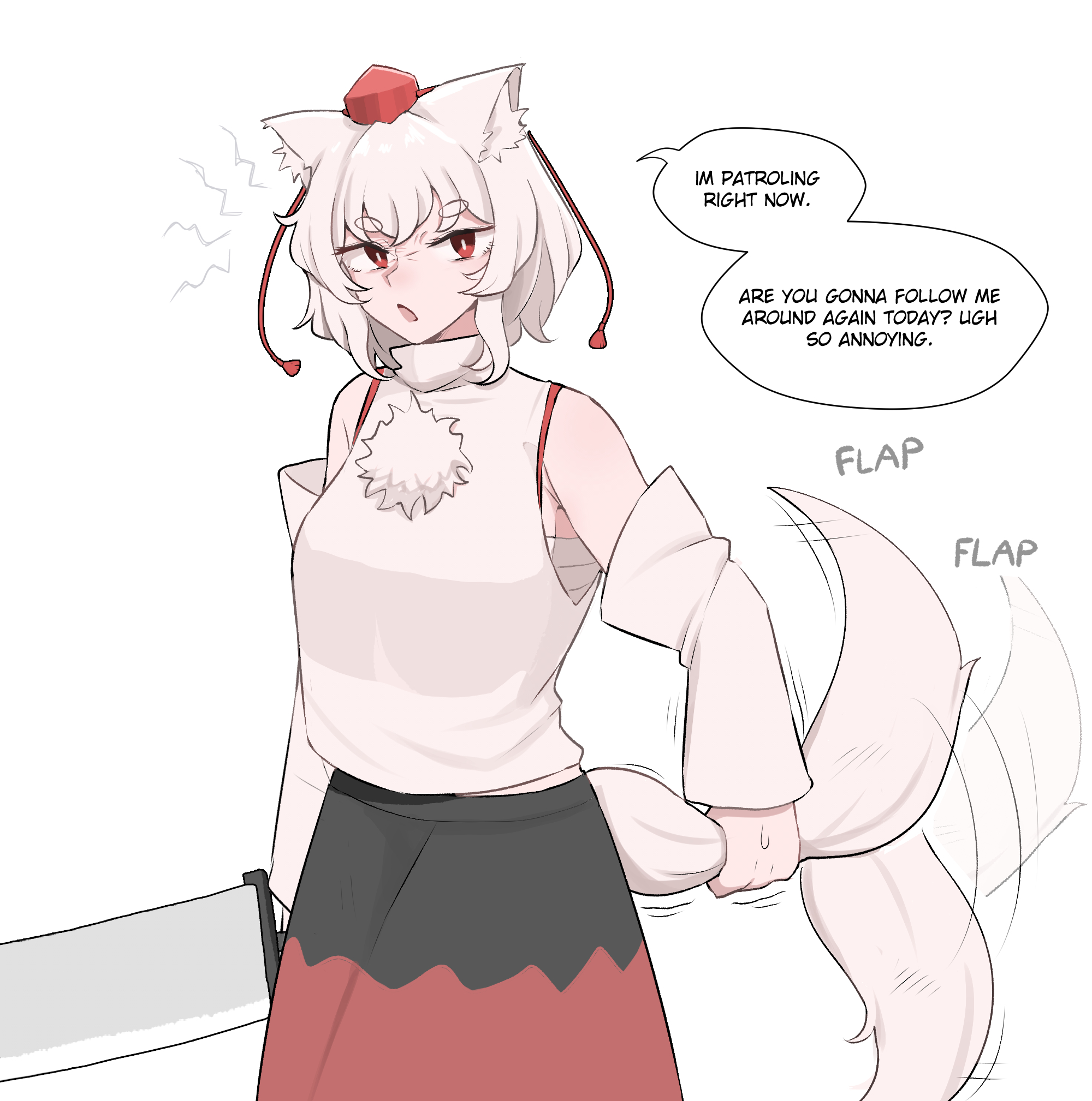 1girl animal_ears black_skirt chest_sarashi commentary detached_sleeves english_commentary english_text hat highres holding_own_tail inubashiri_momiji looking_at_viewer mata_(matasoup) multicolored_skirt open_mouth pom_pom_(clothes) red_eyes red_skirt sarashi shirt short_hair skirt sleeveless sleeveless_shirt sword tail tail_grab tail_wagging tokin_hat touhou tsundere turtleneck weapon white_hair white_shirt wolf_ears wolf_tail