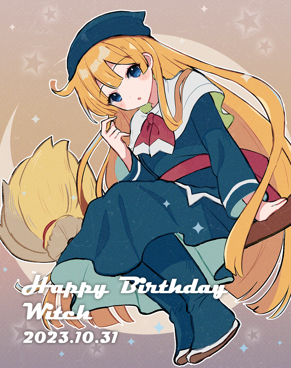 1girl blonde_hair blue_eyes blue_footwear blue_headwear blue_robe blush_stickers broom broom_riding capelet dated eyelashes happy_birthday highres kashima_miyako light_brown_background long_sleeves neckerchief parted_lips puyopuyo red_neckerchief robe sidesaddle solo white_capelet witch witch_(puyopuyo)