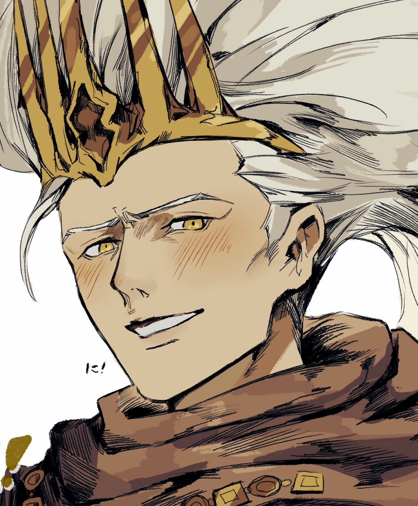 1boy blush brown_scarf crown dark_souls_(series) dark_souls_iii grey_hair grin highres long_hair looking_at_viewer nameless_king orange_eyes portrait scarf simple_background smile solo teeth white_background zunkome