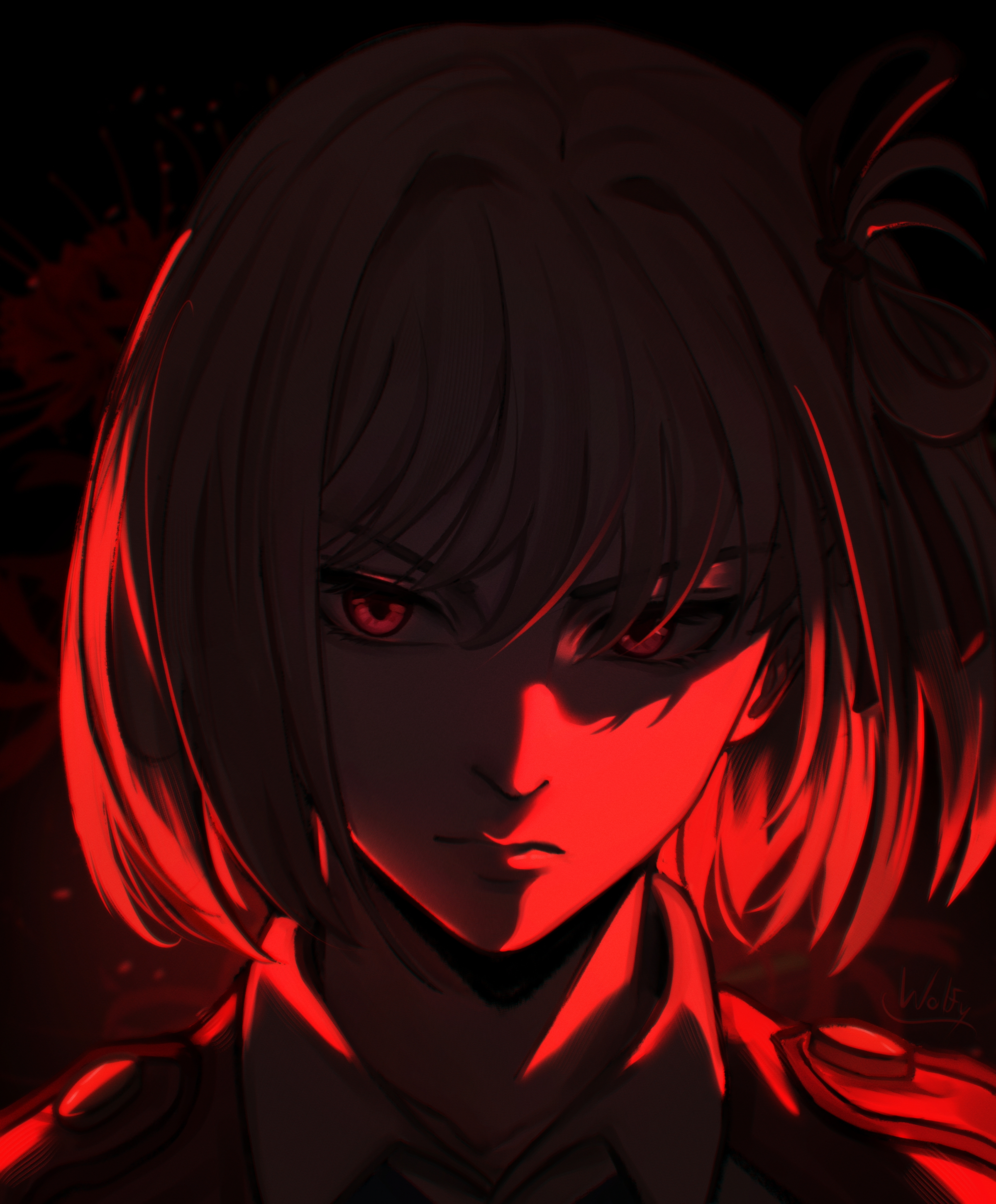 1girl absurdres blonde_hair chxoswolf collared_shirt flower frown hair_ribbon highres looking_at_viewer lycoris_recoil lycoris_uniform monochrome nishikigi_chisato portrait red_eyes red_flower red_ribbon ribbon shirt short_hair signature spider_lily
