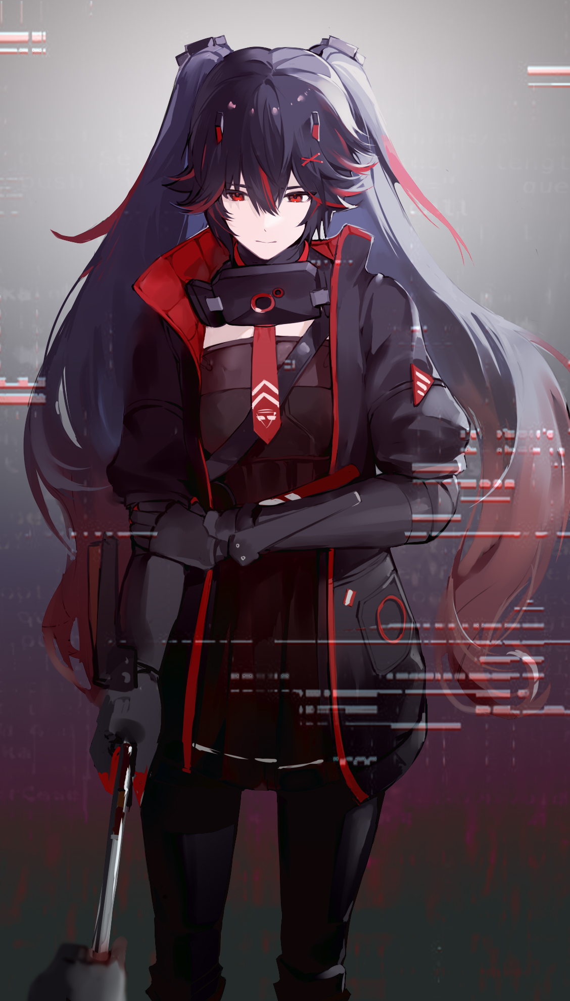 1girl 1other black_coat black_dress black_hair black_skirt chinese_commentary coat commentary double-parted_bangs dress feet_out_of_frame gauntlets glitch gradient_background gradient_hair hair_ornament highres holding holding_sword holding_weapon joints karin_(2290463757) long_hair looking_down lucia:_plume_(pgr) mechanical_arms multicolored_hair necktie off-shoulder_dress off_shoulder pleated_skirt pov puffy_sleeves punishing:_gray_raven red_eyes red_hair red_necktie robot_joints skirt solo_focus streaked_hair sulking sword twintails two-sided_fabric very_long_hair weapon x_hair_ornament