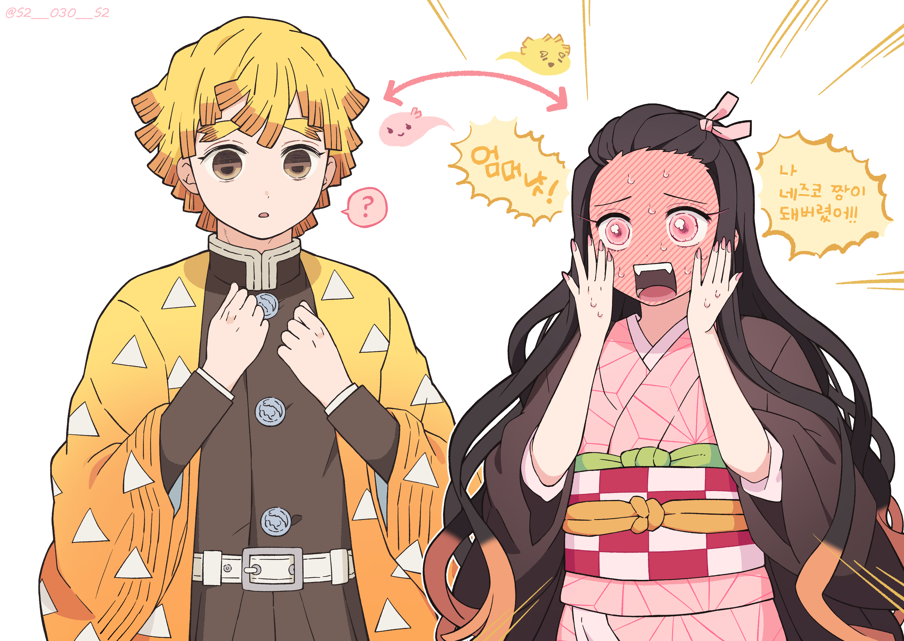 1boy 1girl agatsuma_zenitsu black_hair blonde_hair blush brown_eyes demon_slayer_uniform haori highres japanese_clothes kamado_nezuko kimetsu_no_yaiba kimono korean_text long_hair long_sleeves multicolored_hair open_mouth pink_eyes pov ribbon shimya short_hair translation_request