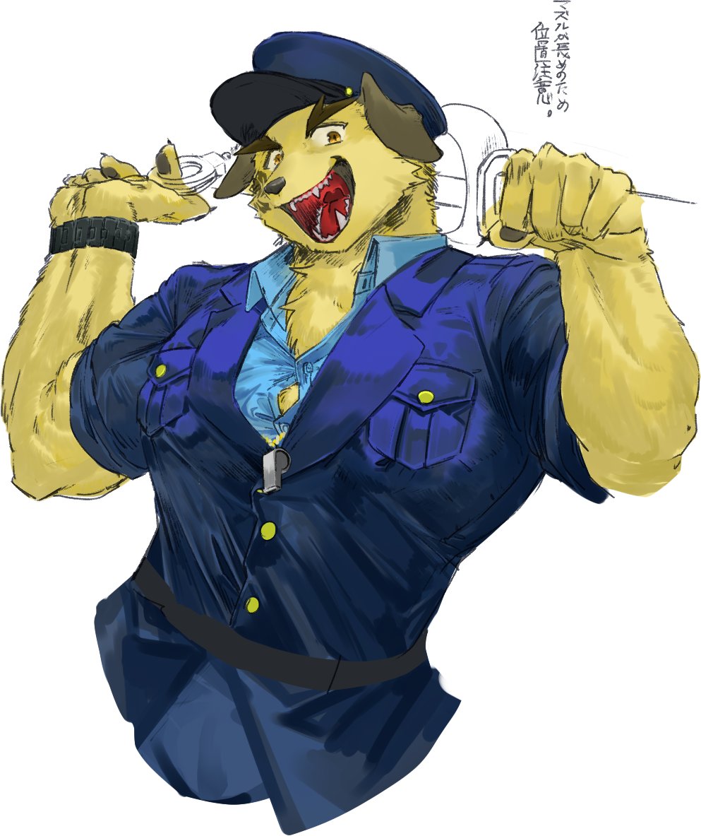 1boy animal_ears bara blue_shirt bursting_pectorals chest_tuft collared_shirt commentary_request cropped_torso cuffs dog_boy dog_ears facial_tattoo fangs furry furry_male handcuffs hat large_pectorals looking_at_viewer male_focus muscular muscular_male nobumichi_(housamo) open_mouth pawpads pectorals police police_hat police_uniform policeman s-skio shirt simple_background smile solo tattoo thick_eyebrows tokyo_houkago_summoners whistle white_background yellow_eyes yellow_fur