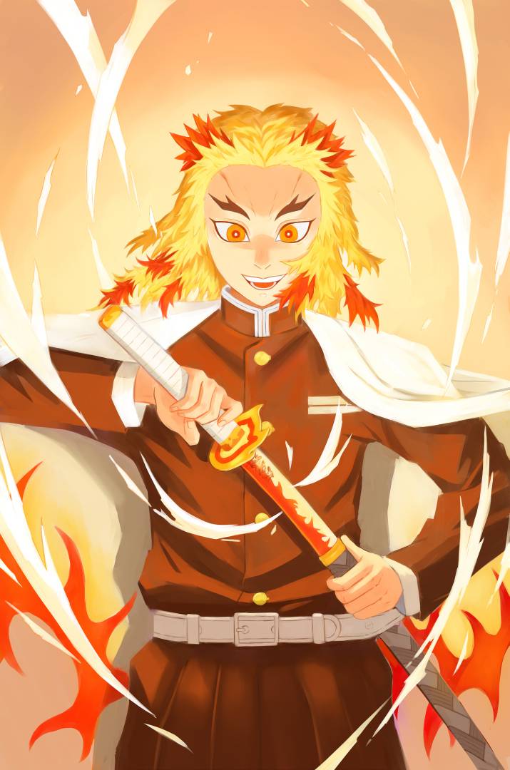 1boy belt belt_buckle black_pants black_shirt blonde_hair buckle buttons cape collared_shirt commentary demon_slayer_uniform english_commentary flame_print high_collar holding holding_sword holding_weapon katana kimetsu_no_yaiba kuwagatata long_sleeves male_focus medium_hair messy_hair multicolored_hair open_mouth orange_background orange_eyes pants pocket red_headwear rengoku_senjurou sheath shirt smile solo straight-on streaked_hair sword teeth thick_eyebrows unsheathing upper_body weapon white_belt white_cape