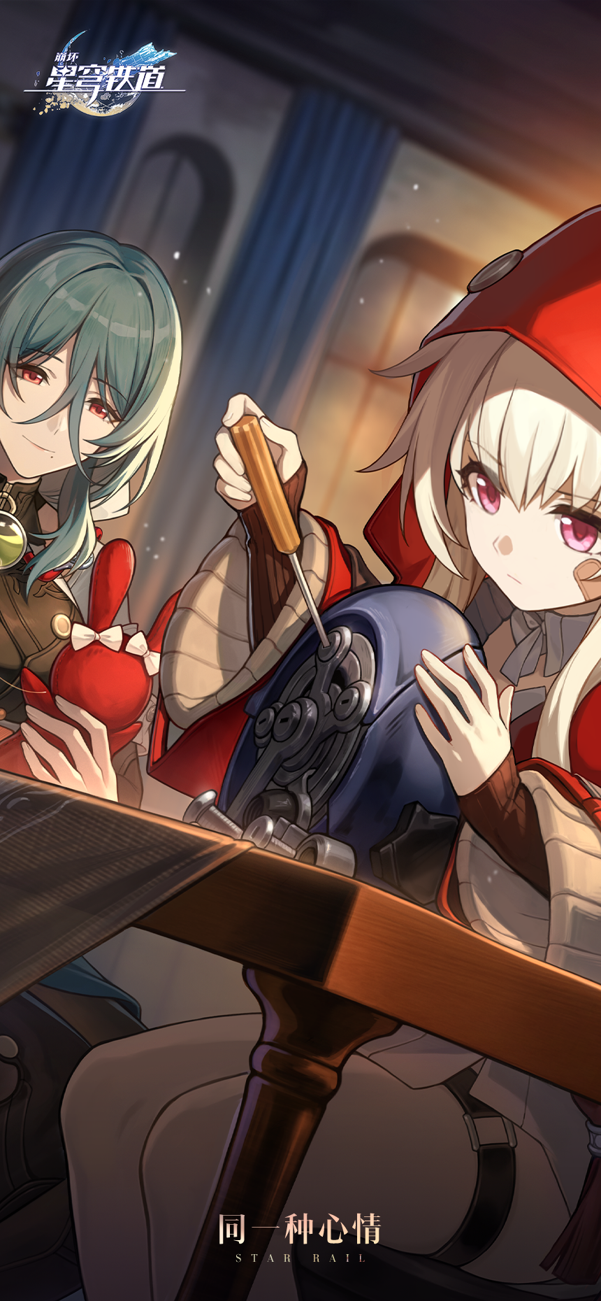 2girls bandage_on_face bandages bare_legs chinese_commentary chinese_text clara_(honkai:_star_rail) closed_mouth hair_between_eyes highres honkai:_star_rail honkai_(series) indoors logo long_sleeves mole mole_under_mouth multiple_girls natasha_(honkai:_star_rail) official_art official_wallpaper red_eyes red_hood sitting smile stuffed_animal stuffed_toy table thigh_strap thighs tools upper_body white_hair window