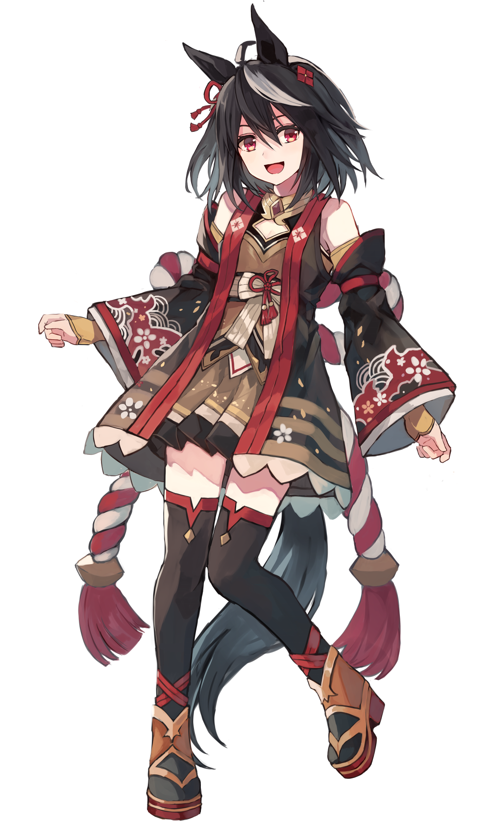 1girl ahoge animal_ears bare_shoulders black_hair black_kimono black_sandals black_sleeves black_thighhighs bob_cut breasts brown_dress cleavage cleavage_cutout clothing_cutout commentary_request detached_sleeves double-parted_bangs dress elbow_sleeve floral_print floral_print_kimono full_body hair_between_eyes hair_intakes hair_ornament hand_up highres horse_ears horse_girl horse_tail japanese_clothes kimono kitasan_black_(umamusume) kouhaku_nawa looking_at_viewer medium_breasts multicolored_hair natsuyuki obi open_mouth partial_commentary pleated_skirt print_kimono red_eyes rope sandals sash shimenawa short_hair simple_background skirt smile solo standing standing_on_one_leg streaked_hair tail thighhighs two-tone_hair two_side_up umamusume white_background white_hair wide_sleeves yellow_sleeves zouri
