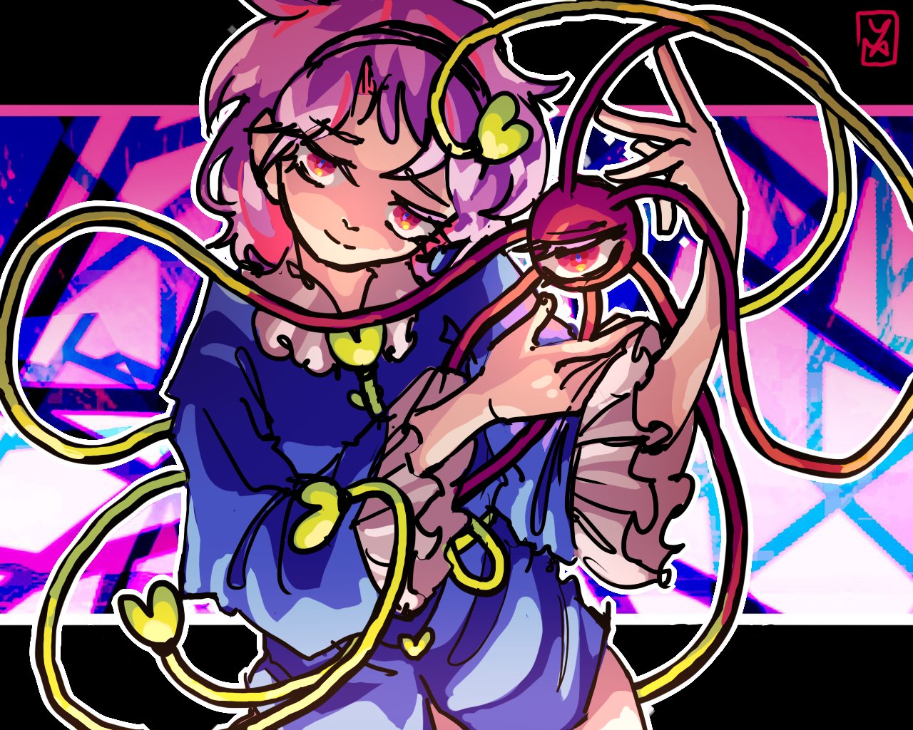 1girl black_border black_hairband blue_shirt border buttons closed_mouth collar collared_shirt colored_eyelashes frilled_sleeves frills hair_ornament hairband head_tilt heart heart_button heart_hair_ornament komeiji_satori long_sleeves looking_at_viewer outline pink_background pink_eyes pink_hair pink_skirt satori_day shirt short_hair signature skirt smile solo third_eye touhou upper_body waiwa_way white_collar white_outline wide_sleeves