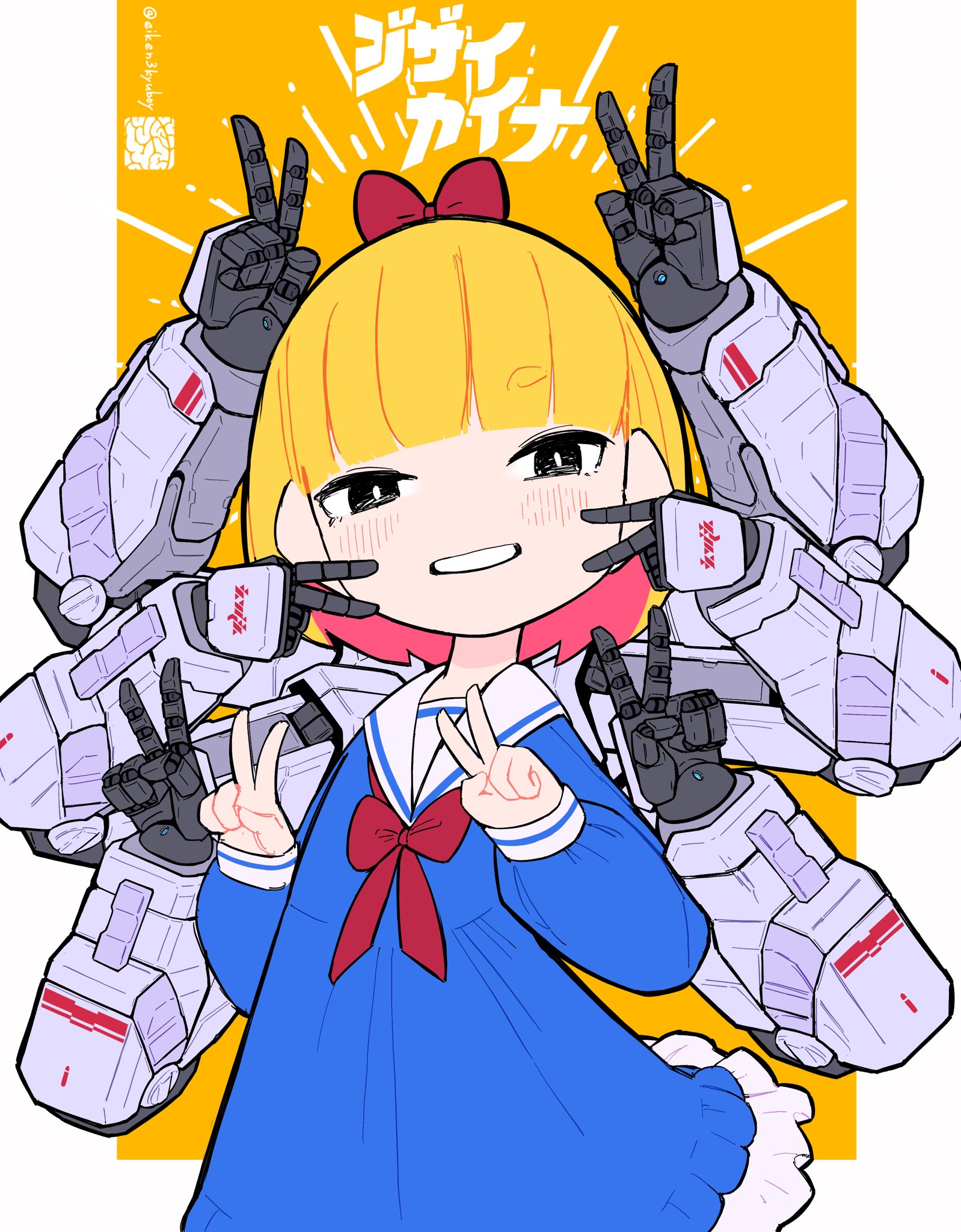 1girl black_eyes blonde_hair blue_dress bow dress extra_arms hair_bow hands_up highres iwako_(eiken3kyuboy) long_sleeves looking_at_viewer mechanical_arms neck_ribbon open_mouth original red_bow red_ribbon ribbon sailor_collar short_hair solo teeth tsurime twitter_username v white_sailor_collar