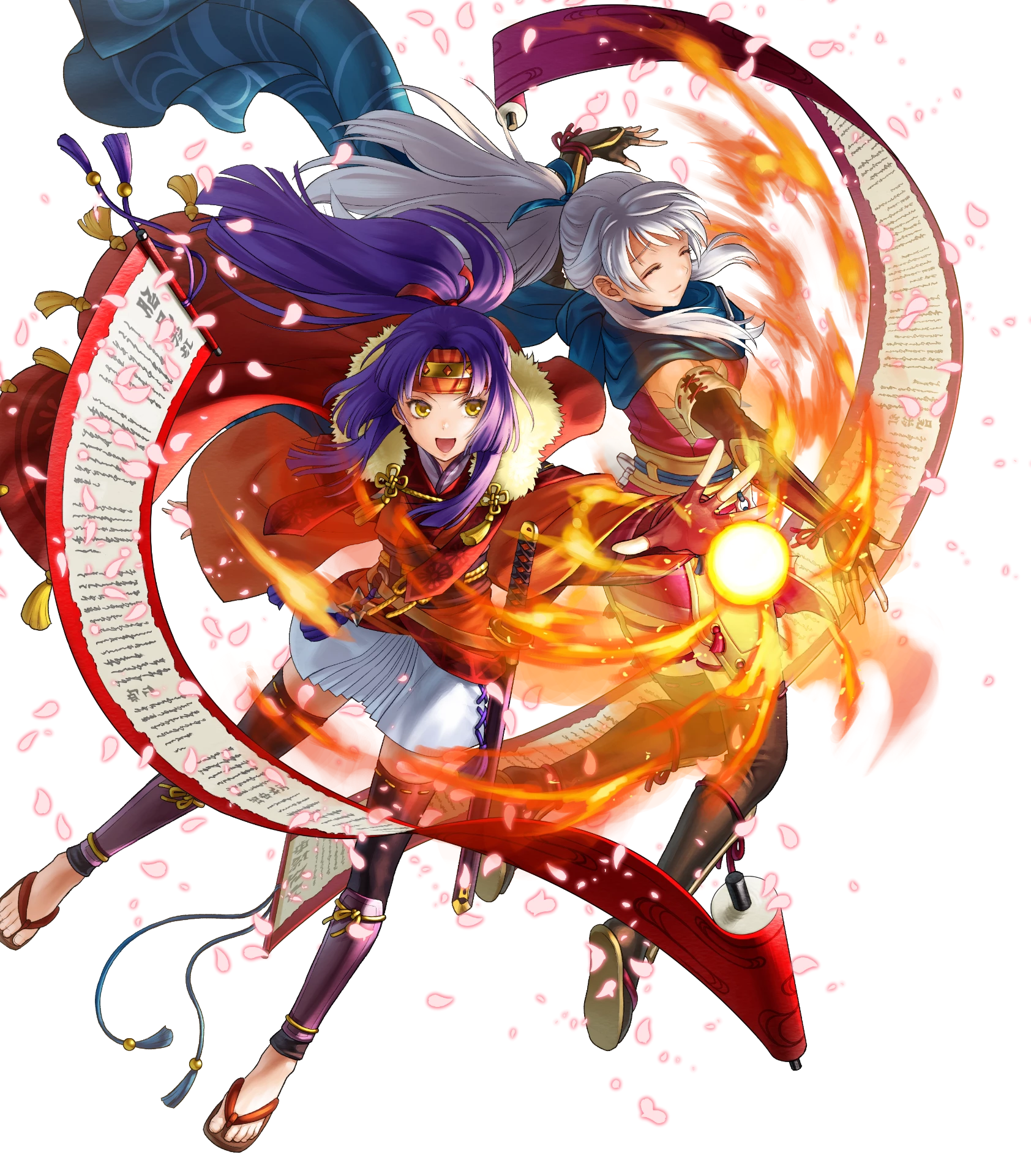 2girls arm_guards attack black_gloves black_thighhighs closed_eyes fingerless_gloves fire fire_emblem fire_emblem:_radiant_dawn fire_emblem_heroes gloves hair_ribbon headband highres japanese_clothes kita_senri long_hair micaiah_(fire_emblem) micaiah_(ninja)_(fire_emblem) multiple_girls ninja nintendo non-web_source official_alternate_costume official_alternate_hairstyle official_art open_mouth ponytail purple_hair ribbon sanaki_kirsch_altina sanaki_kirsch_altina_(ninja) scarf scroll smile thighhighs white_background white_hair yellow_eyes zettai_ryouiki